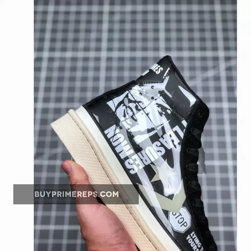 Inspired by punk rock, this collaboration takes the Pro Leather in a bold new direction. The high-cut upper of the sneaker serves as the canvas for bold printed patterns. A black Tyvek base is adorned with stark white punk-style graphics, including a sneering visage and a “Stop Lying To Yourself” hit. The crinkled construction of the print is designed to wear down over time, creating a unique broken-in style. To protect the print, a translucent outer layer with a Converse Chevron logo is added, ensuring that the graphics don’t fade too quickly.