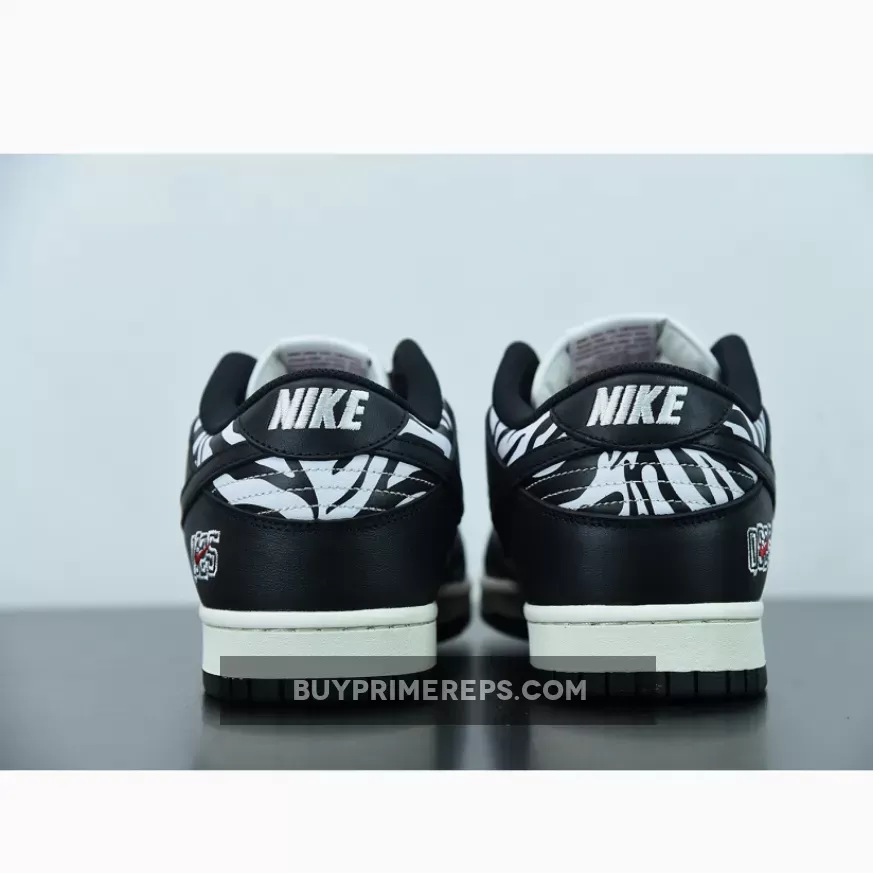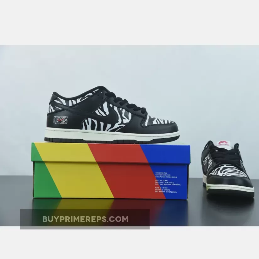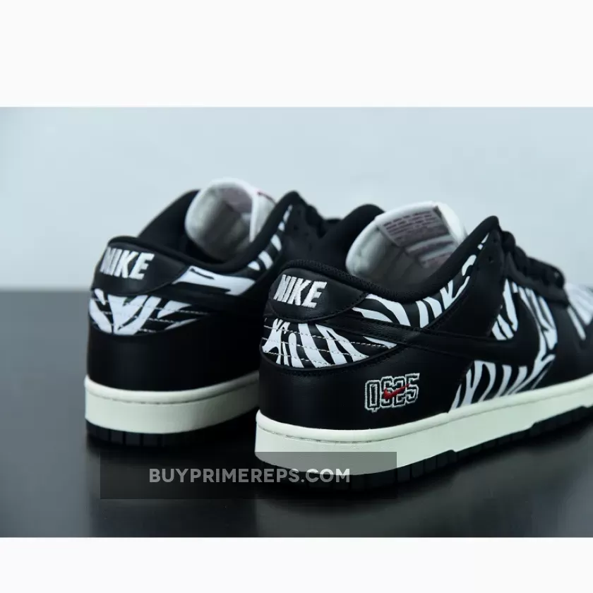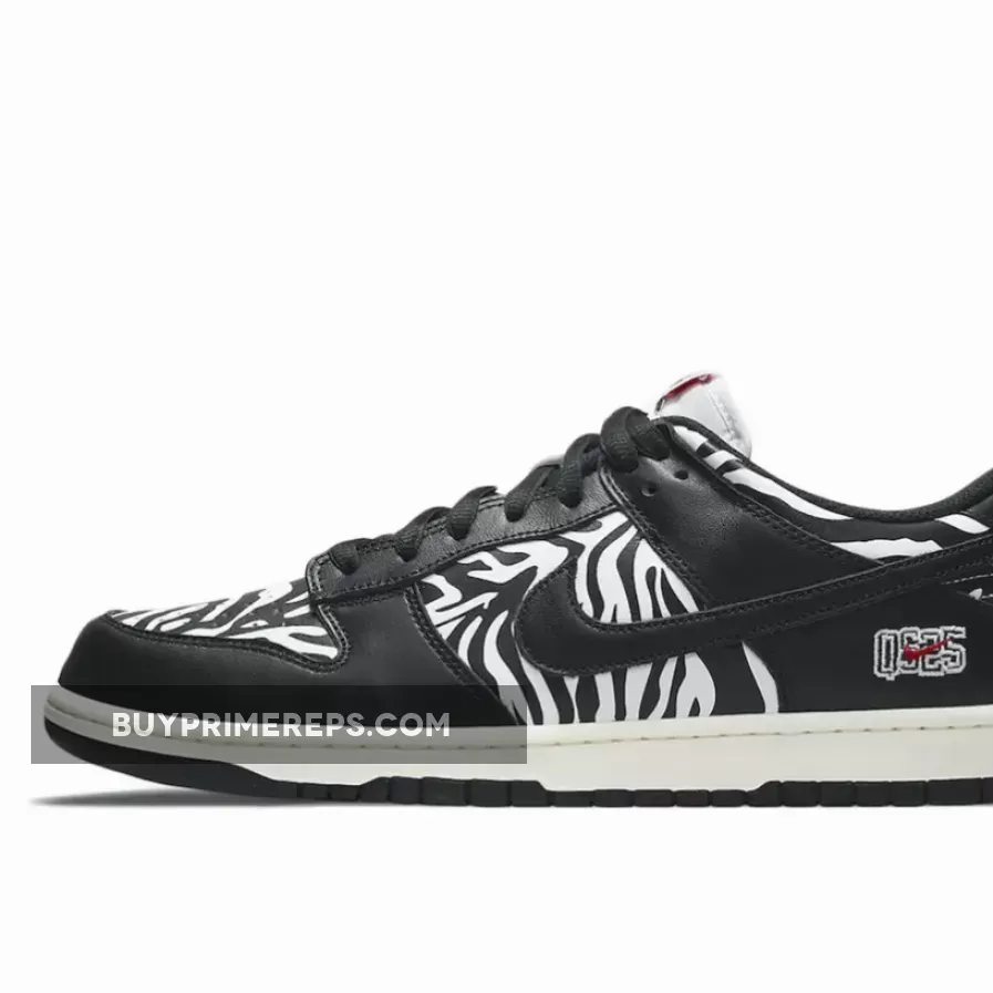 The Quartersnacks x Nike SB Dunk Low “Zebra Cakes” is not just about aesthetics. It also offers exceptional comfort and performance, making it suitable for skateboarding or everyday wear. The shoe features a sail midsole, providing cushioning and support, while the black rubber outsole ensures traction and durability on various surfaces.