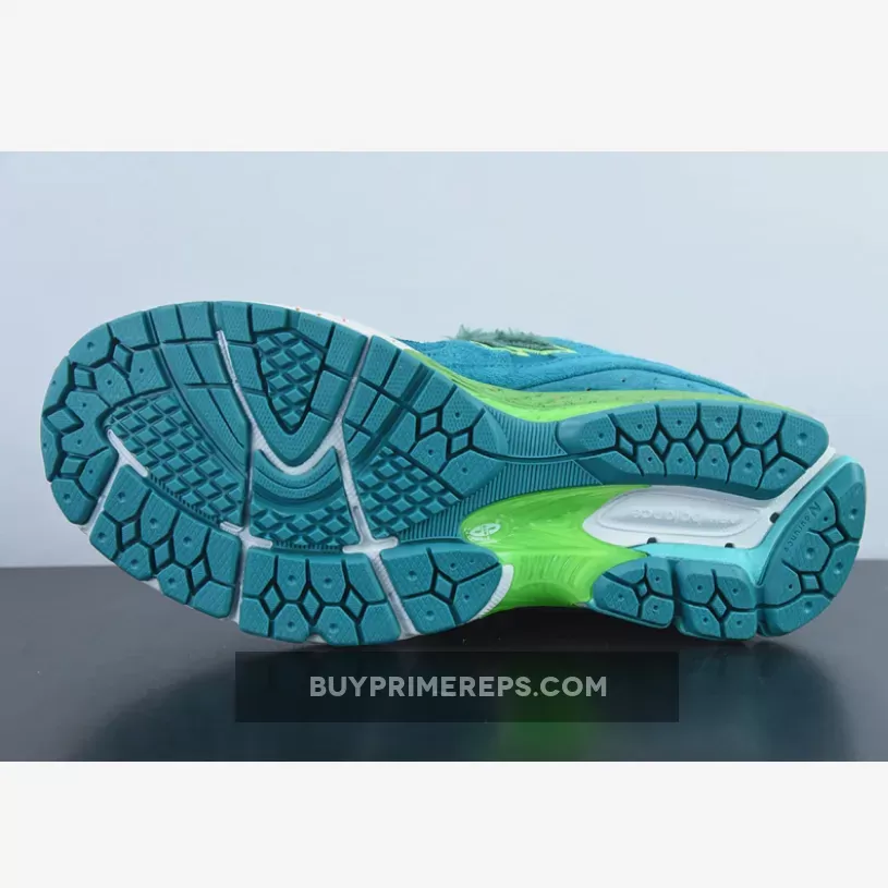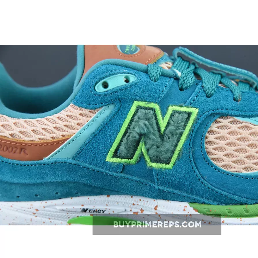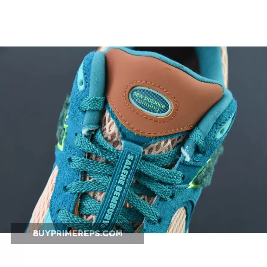 Detailed imagery reveals the meticulous attention to detail. Salmon peeks through mesh underlays, while an speckled orange midsole adds a touch of dynamic energy. Neon green accents on the Stability Web TPU shank, NERGY foam midsole, and “N” logo outline complete the vibrant story.