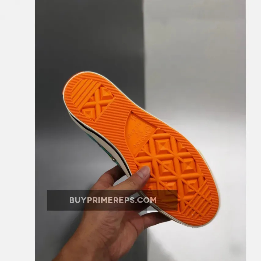 Underneath, a white rubber sole provides a clean and classic look. The sole also conceals high-end cushioning technology developed in collaboration with Nike, offering superior comfort and support for all-day wear. Black and orange stripes continue the colorway, adding a touch of contrast and tying the design together. The round rubber toe box completes the look, giving the shoe its iconic Chuck 70 silhouette.
