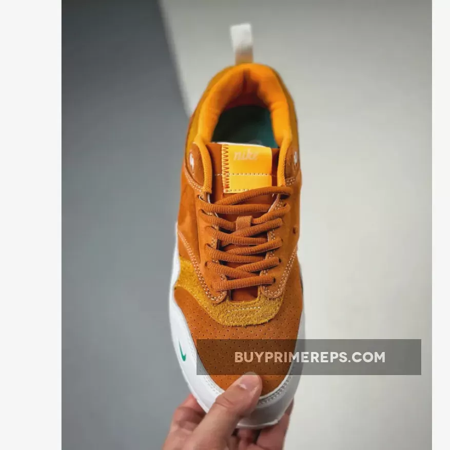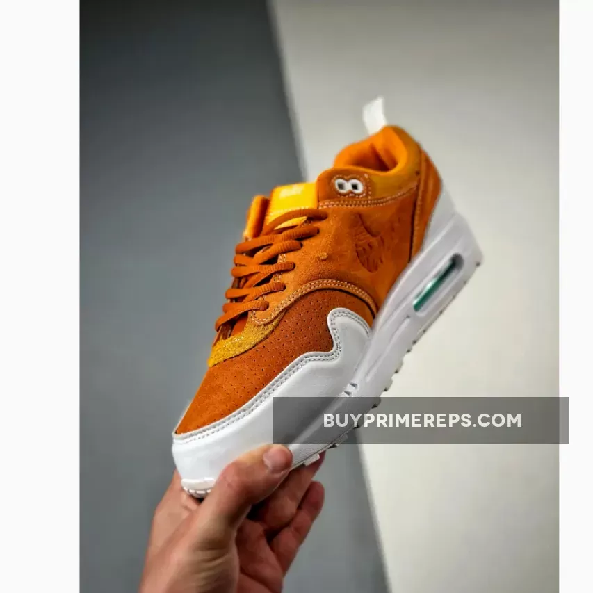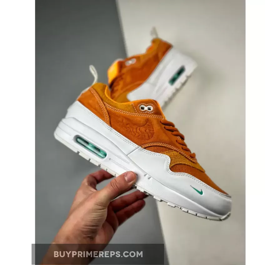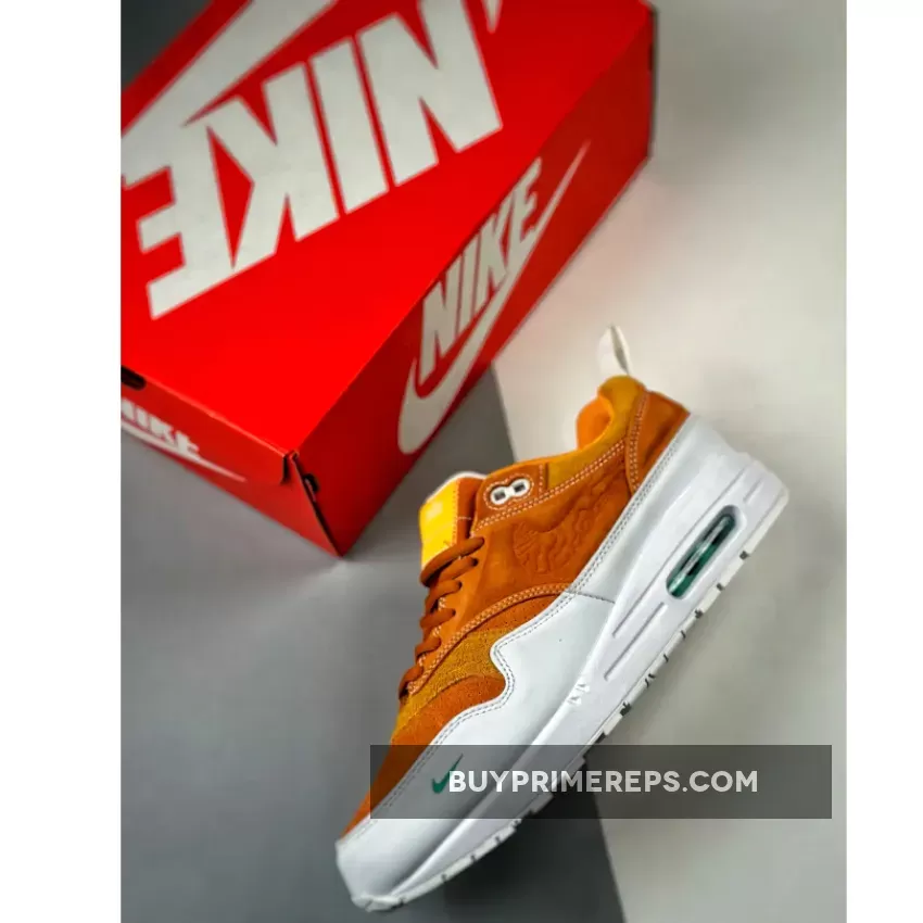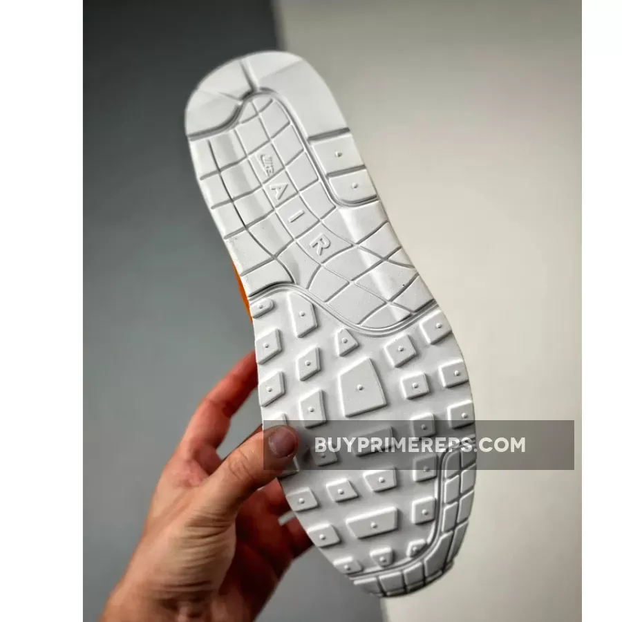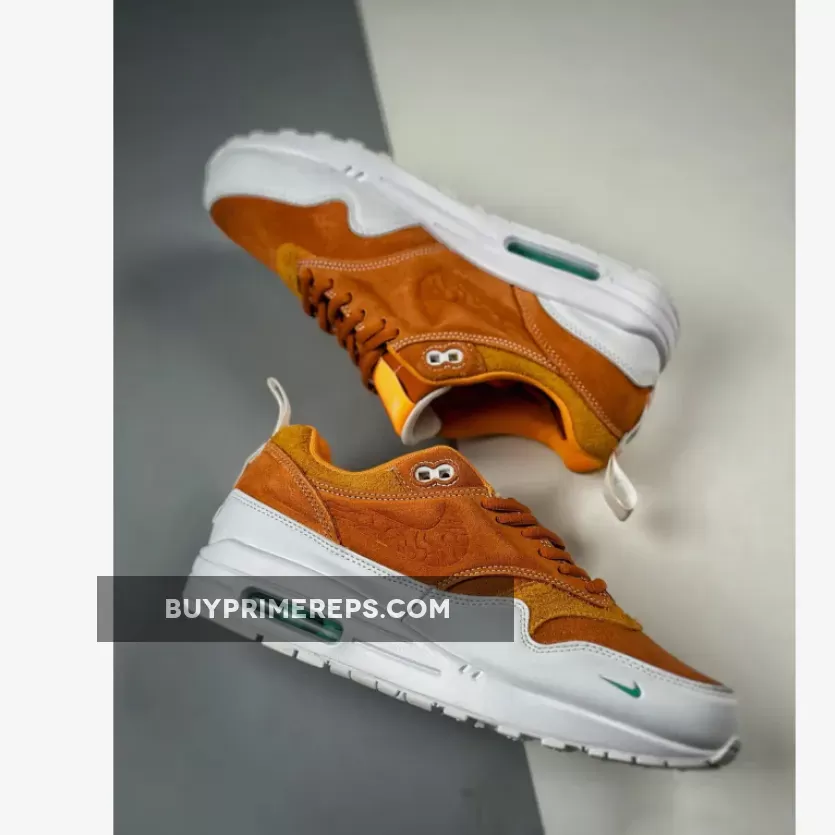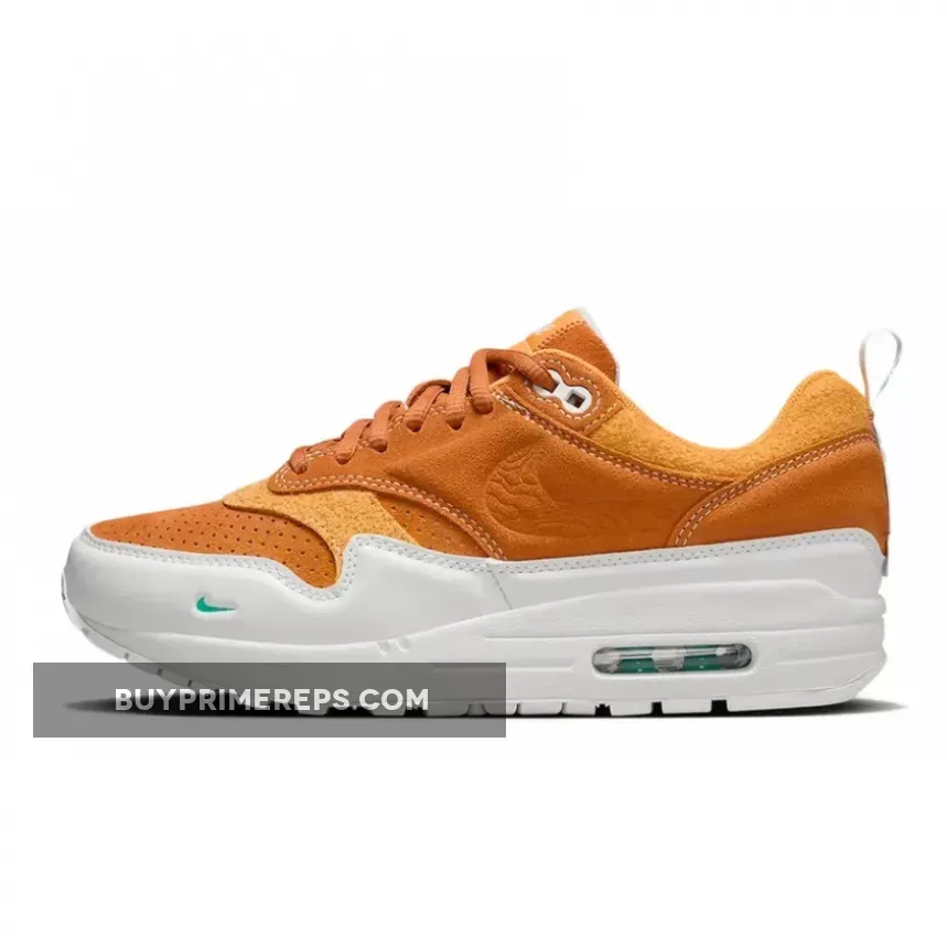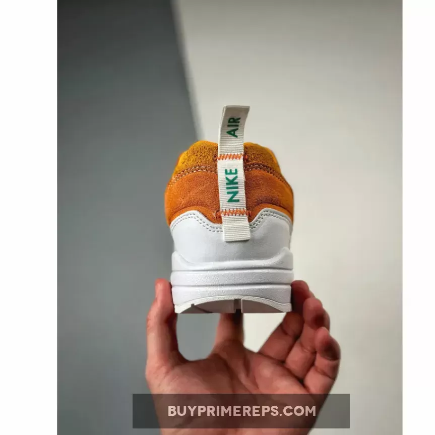 This special edition Air Max 1 showcases a unique blend of sportswear innovation and design. The upper features a combination of orange and white, with orange suede covering the forefoot rand and collar, adding a touch of luxury to the ’87 icon. The tan suede base is complemented by perforated toe panels and topographic Swoosh textures, adding depth and visual interest to the design. Crisp white tones make up the mudguard and midsole, creating a clean and fresh look.