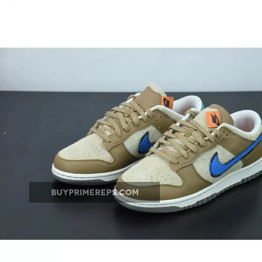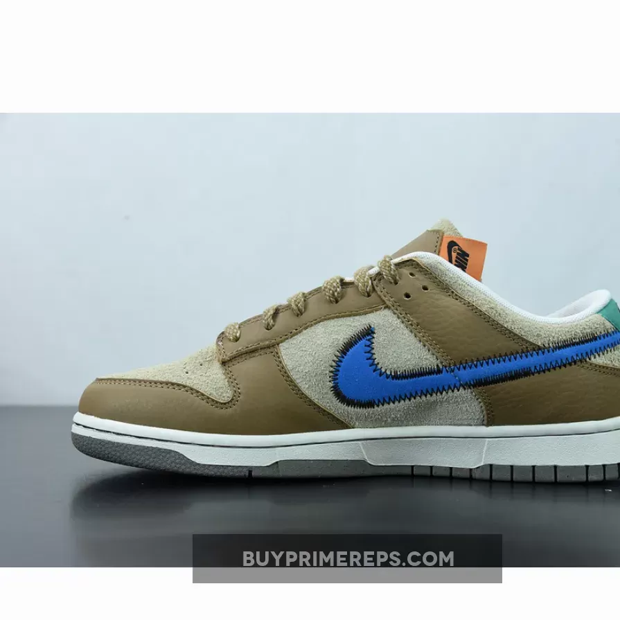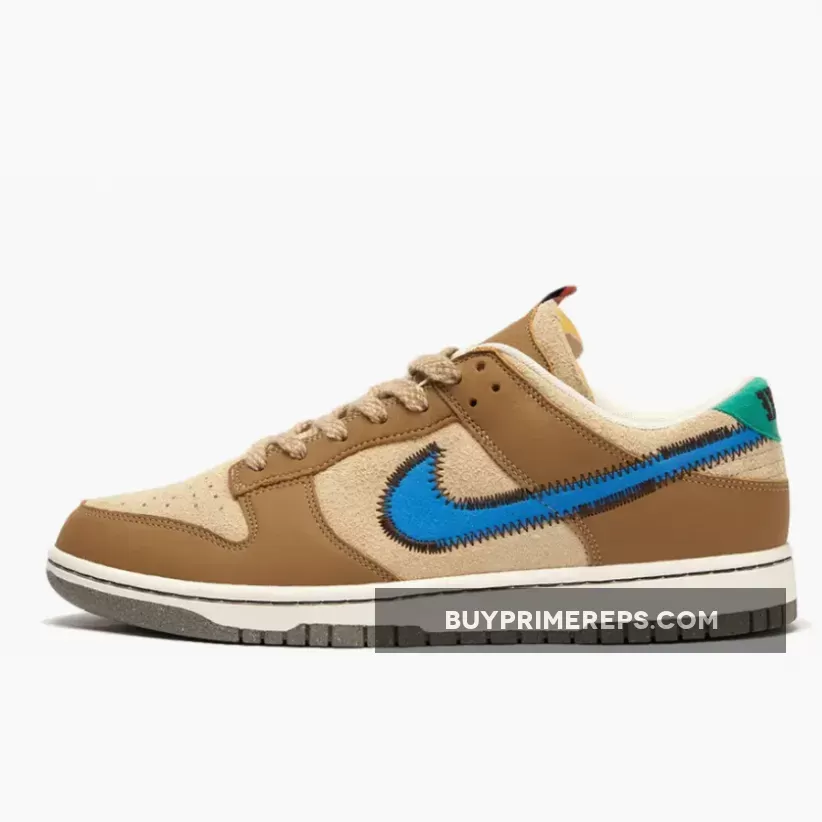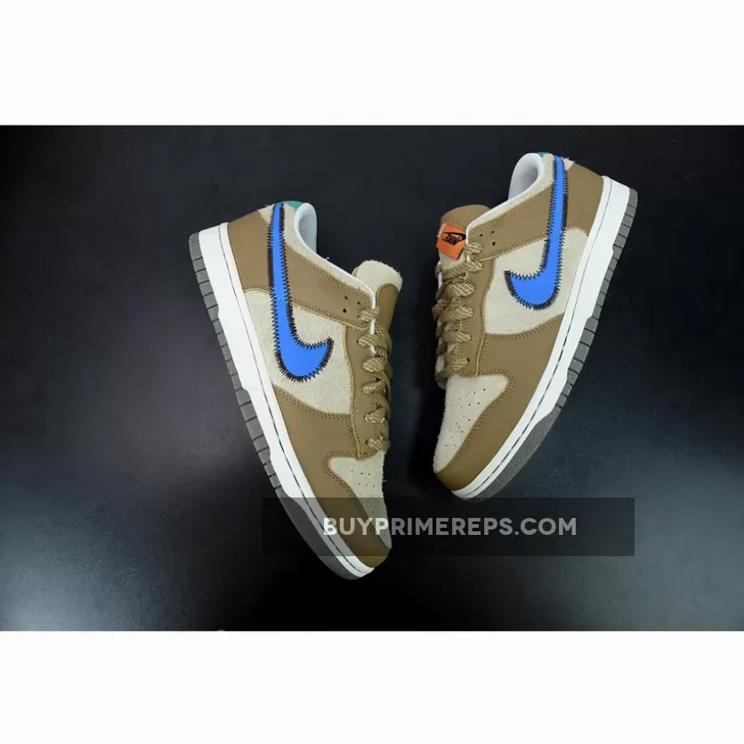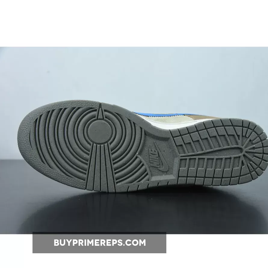 One of the standout features of this collaboration is the bold blue stitched Nike check on the sides. The blue Swooshes stand out against the brown backdrop, adding a vibrant pop of color to the shoe. The attention to detail is evident with the black stitching that outlines the Swooshes, adding a touch of sophistication to the design.
