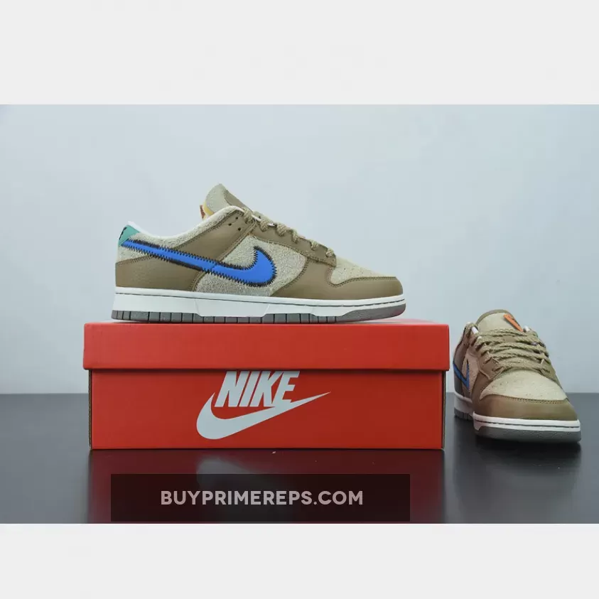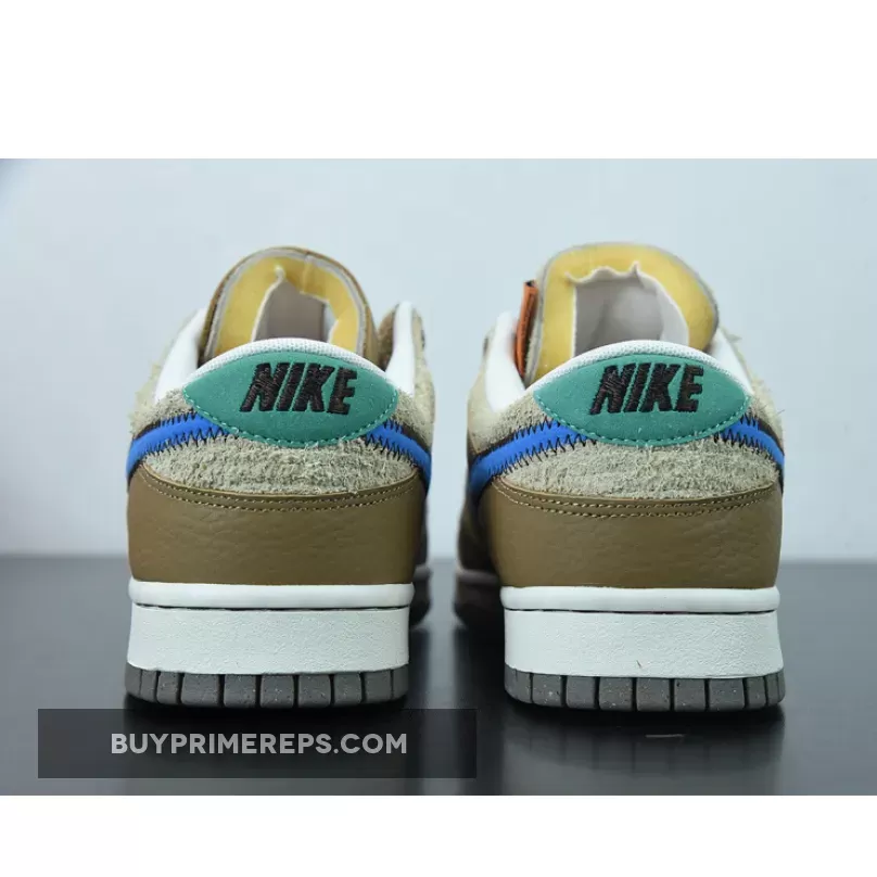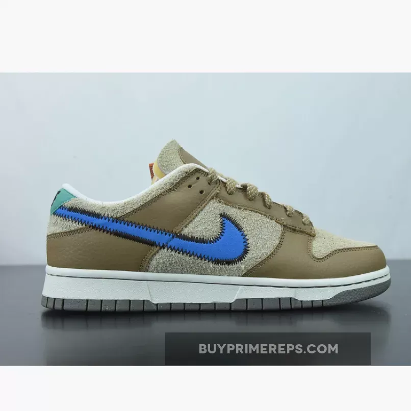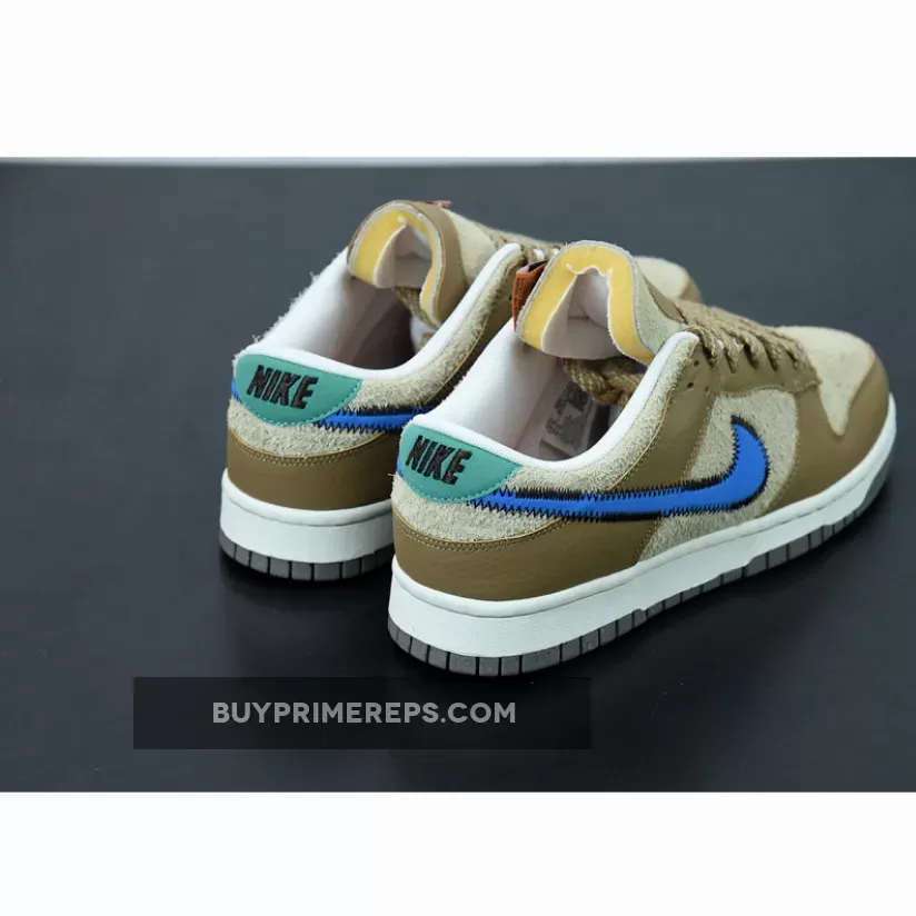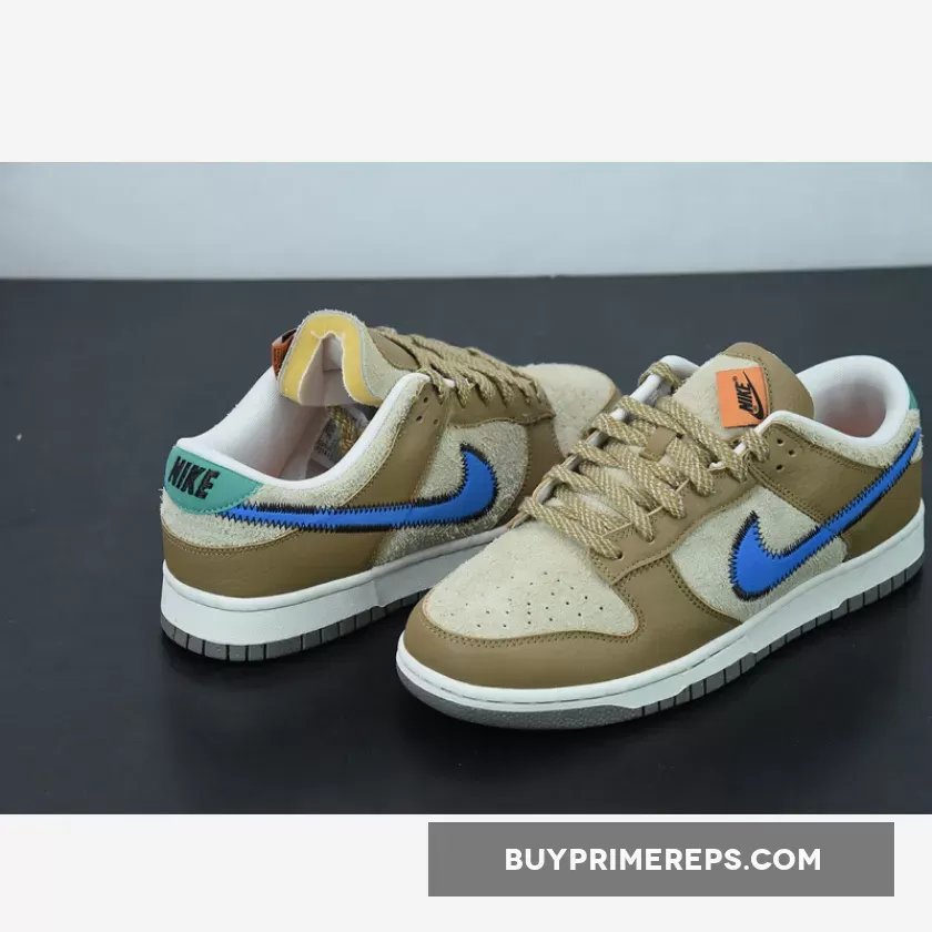 One of the standout features of this collaboration is the bold blue stitched Nike check on the sides. The blue Swooshes stand out against the brown backdrop, adding a vibrant pop of color to the shoe. The attention to detail is evident with the black stitching that outlines the Swooshes, adding a touch of sophistication to the design.