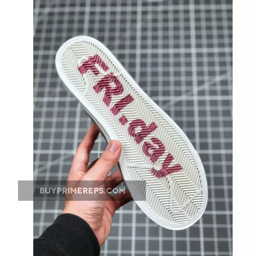 Another standout feature is the asymmetrically styled “FRI” and “day” embossed on the back of the shoe. This detail emphasizes the name of the collaboration and adds an extra touch of style. Additionally, red co-branded detailing is debossed onto leather tags on the tongue, completing the design with a subtle yet impactful finishing touch.