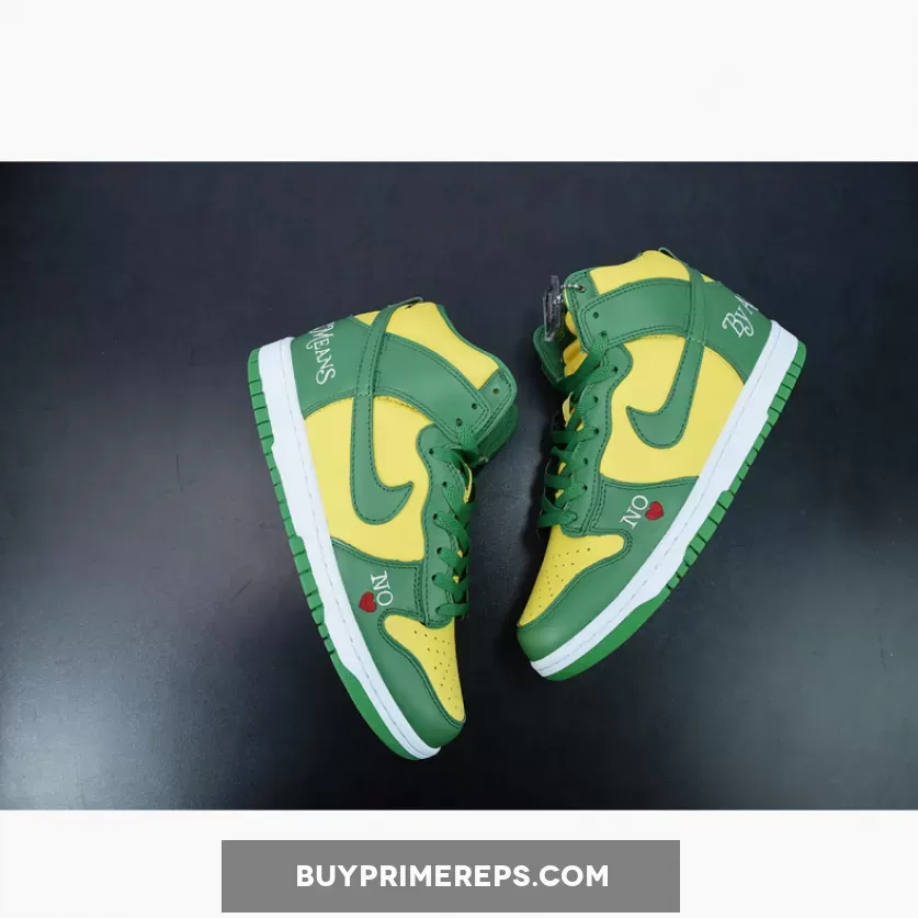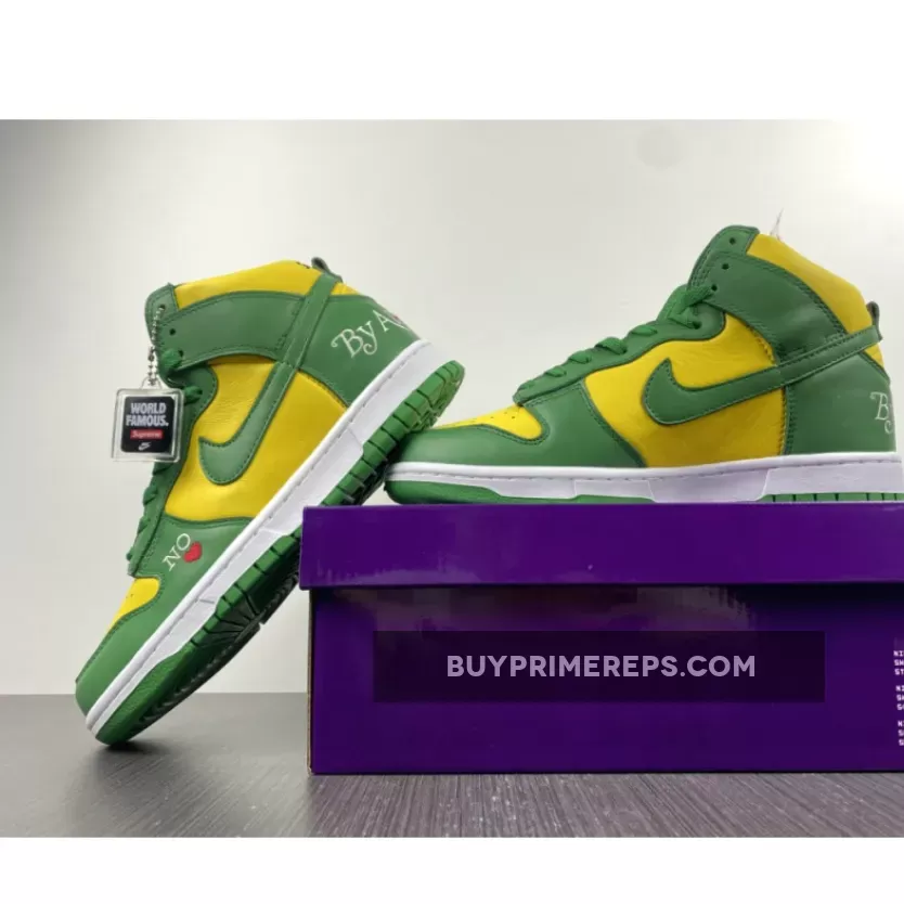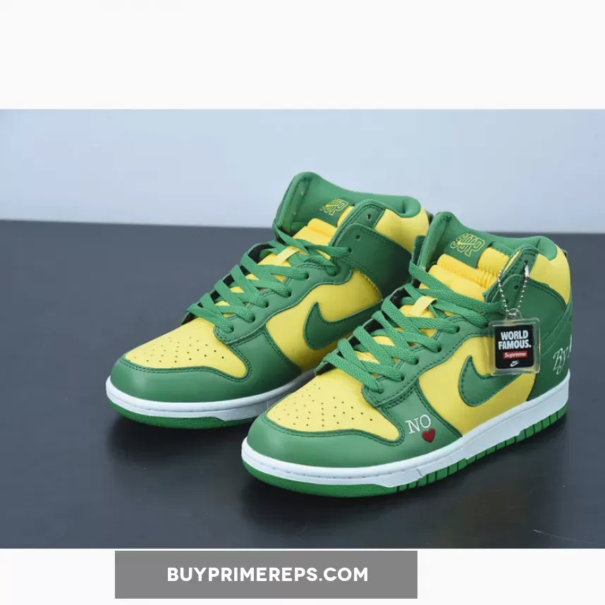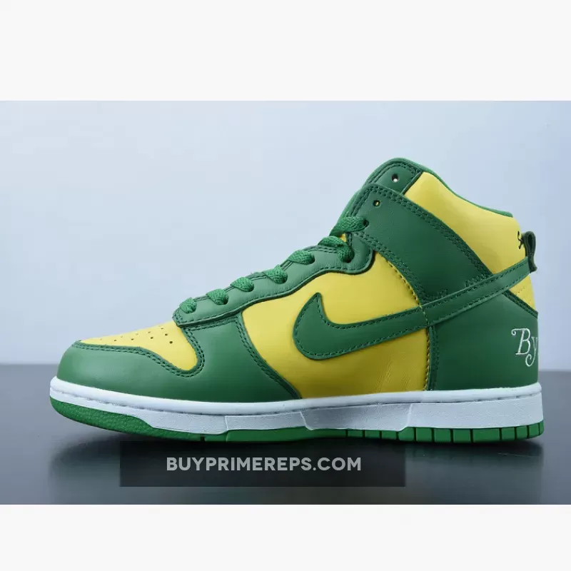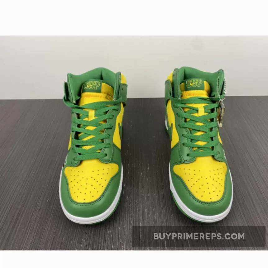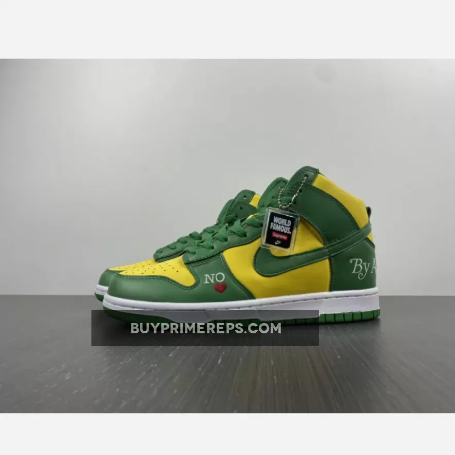 The Supreme x Nike SB Dunk High Brazil Pine Green is a collaboration between the renowned streetwear brand Supreme and sportswear giant Nike. This highly anticipated release draws inspiration from the vibrant colors of the Brazilian flag, resulting in a visually striking sneaker that is sure to turn heads.