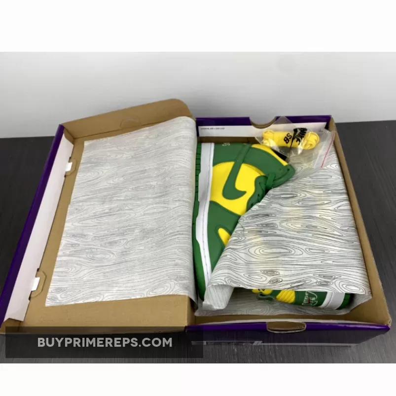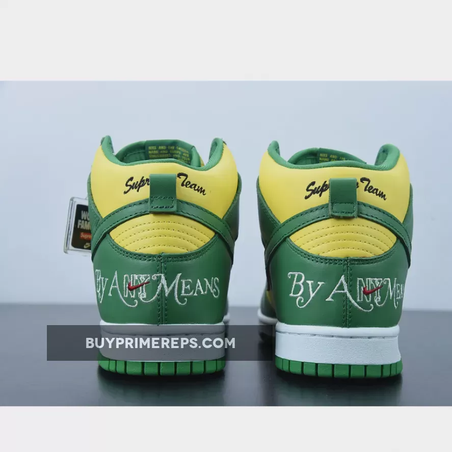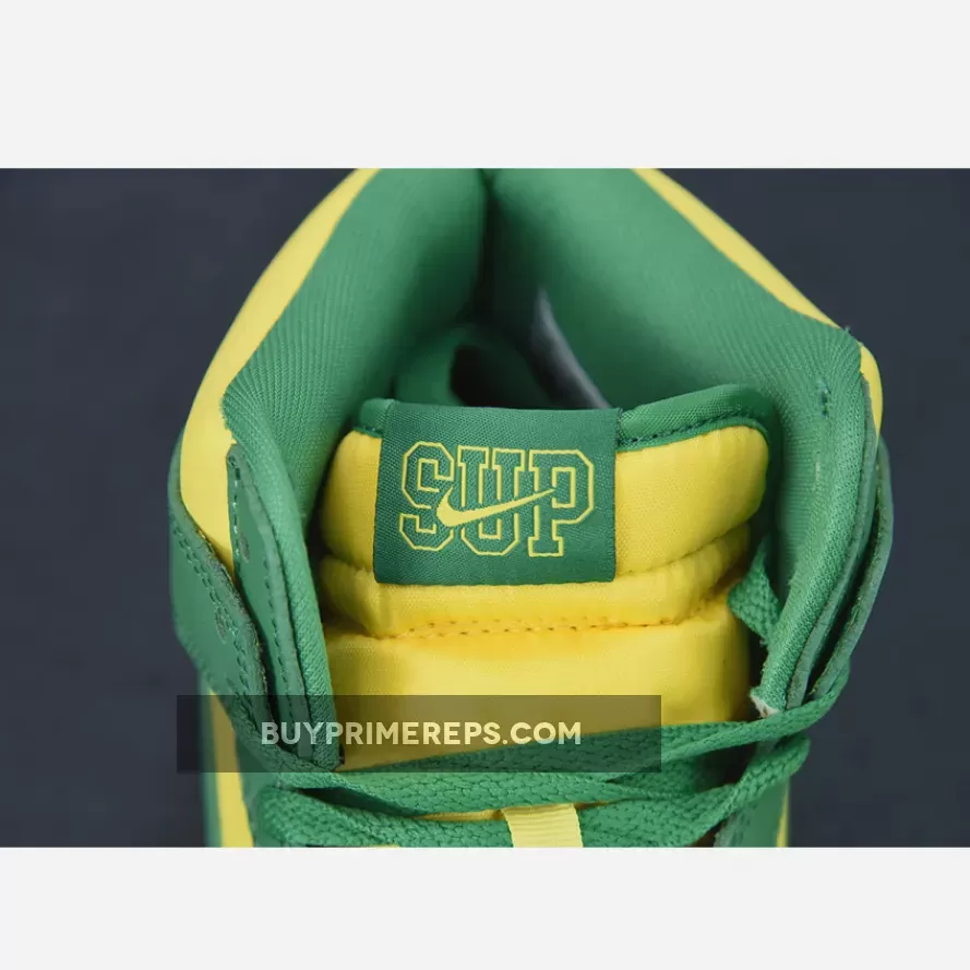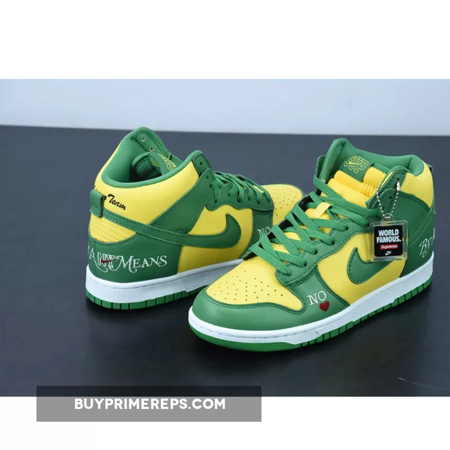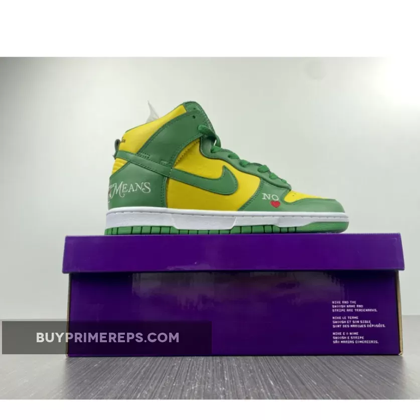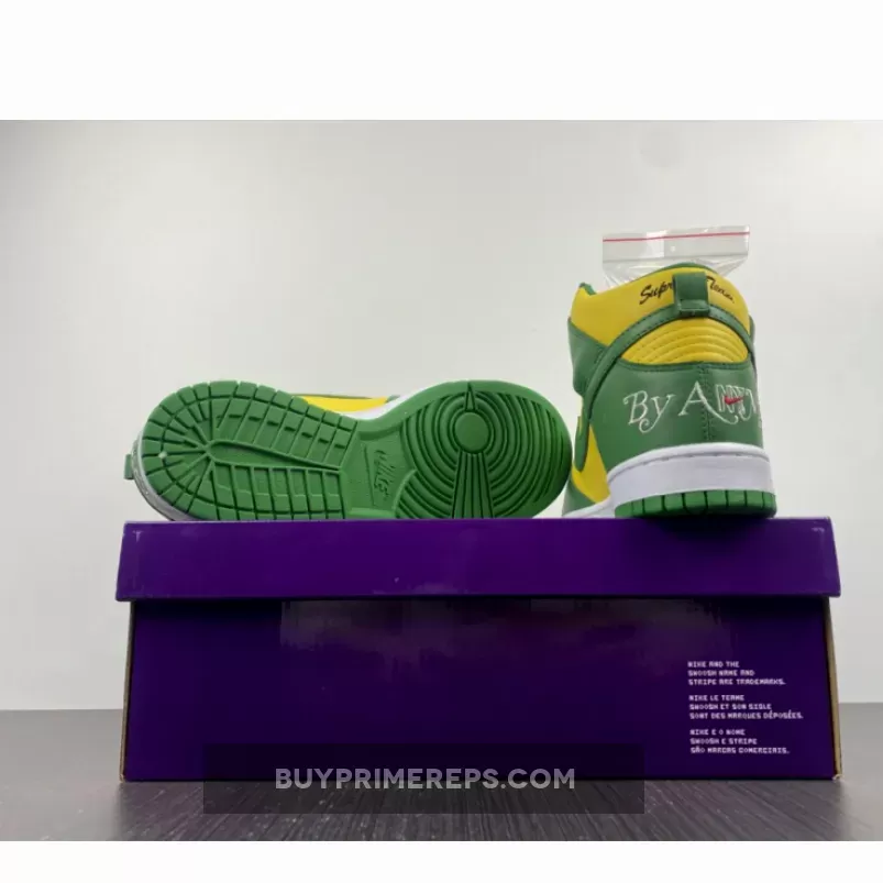 The Supreme x Nike SB Dunk High Brazil Pine Green is a collaboration between the renowned streetwear brand Supreme and sportswear giant Nike. This highly anticipated release draws inspiration from the vibrant colors of the Brazilian flag, resulting in a visually striking sneaker that is sure to turn heads.