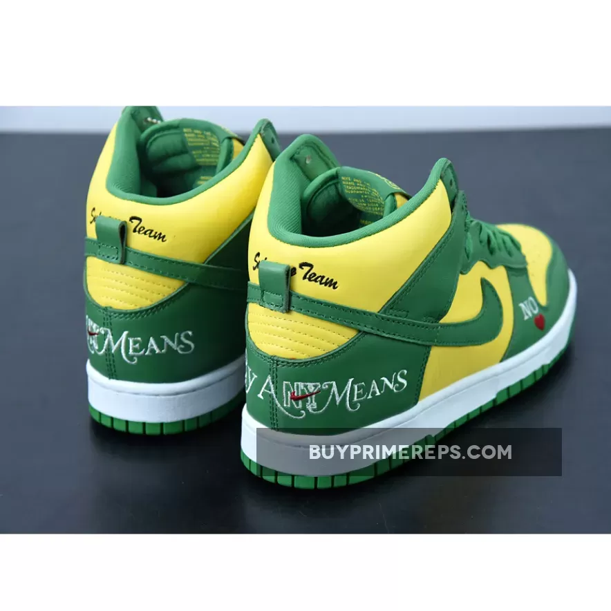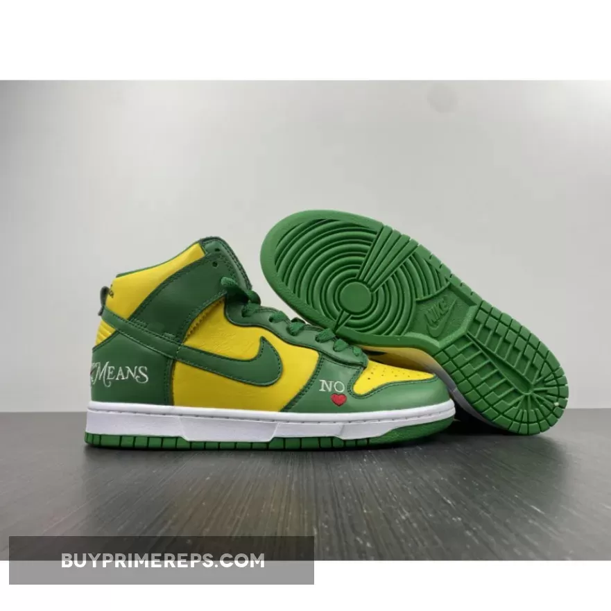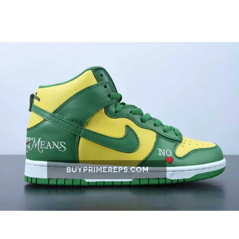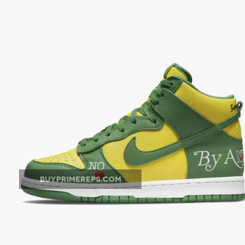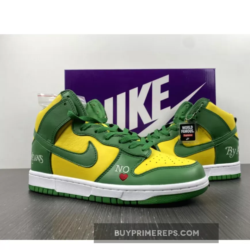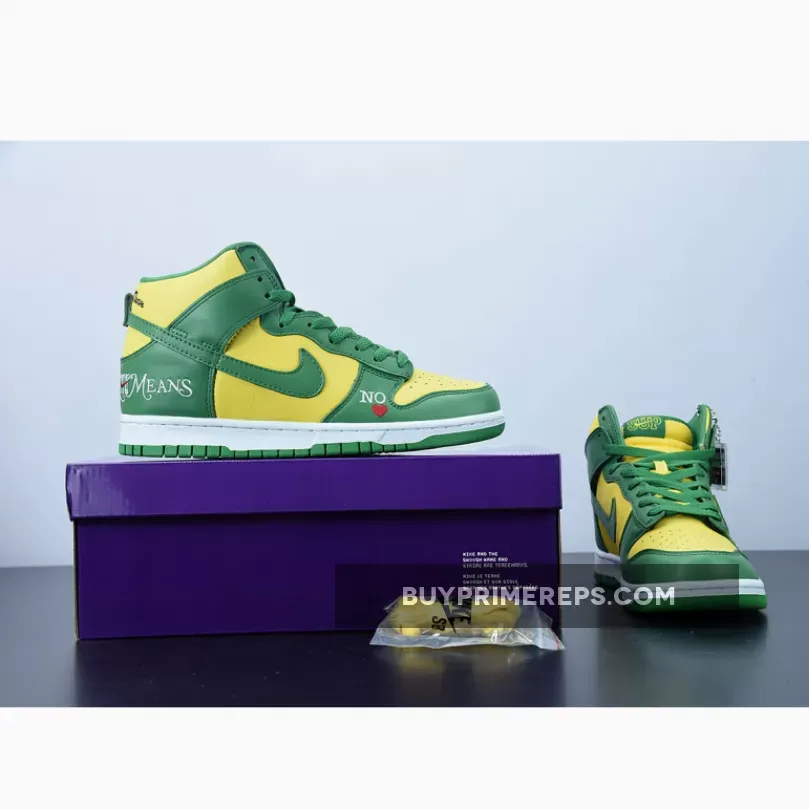 The Supreme x Nike SB Dunk High Brazil Pine Green is a collaboration between the renowned streetwear brand Supreme and sportswear giant Nike. This highly anticipated release draws inspiration from the vibrant colors of the Brazilian flag, resulting in a visually striking sneaker that is sure to turn heads.
