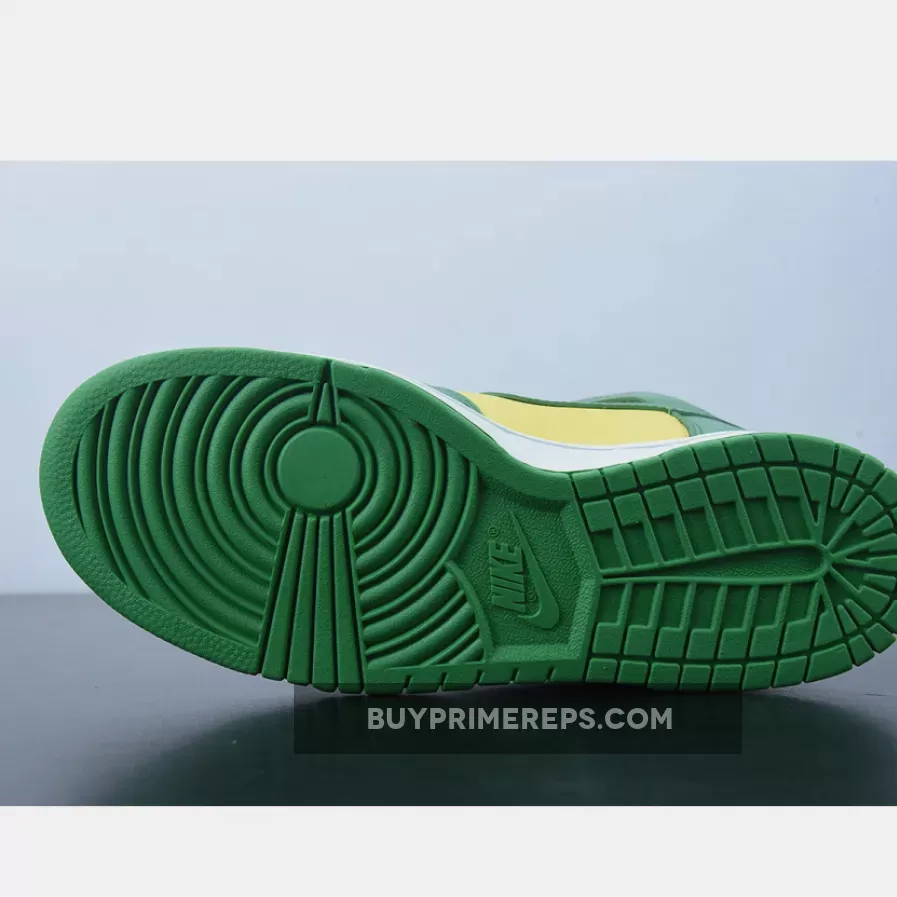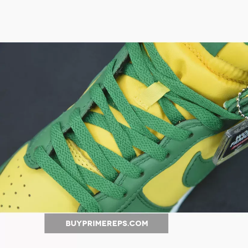 The shoe features a combination of yellow-green and bright green leather panels, reminiscent of the lush landscapes and tropical vibes of Brazil. The color blocking is reminiscent of the popular Nike Dunk Low “Brazil” colorway, giving the shoe a familiar yet unique look. The yellow-green smooth leather serves as the base, while the bright green panels adorn the toe box, throat, and ankle areas.