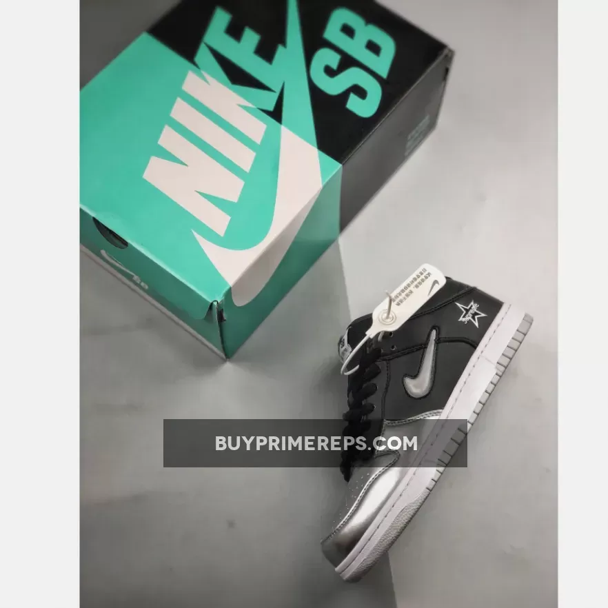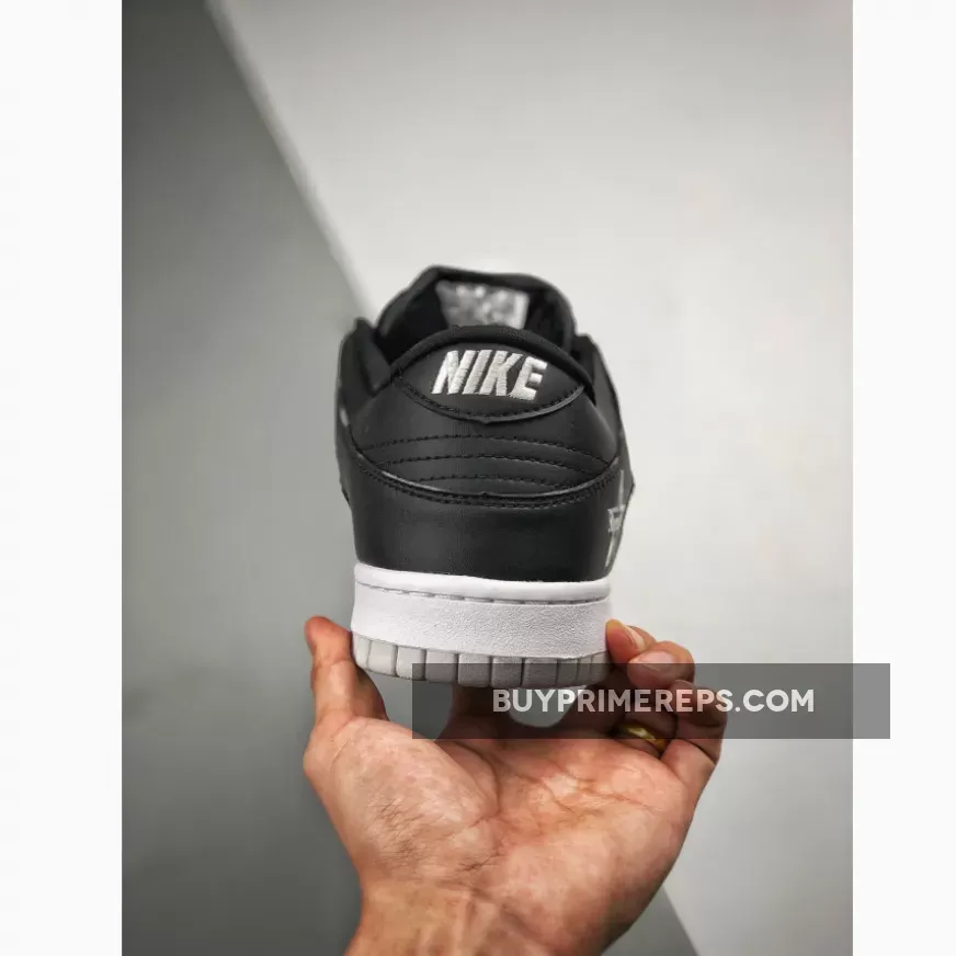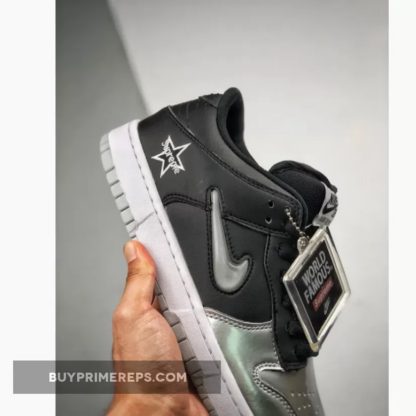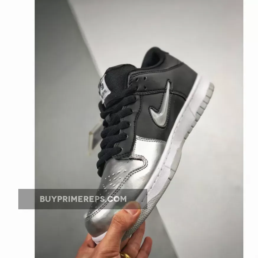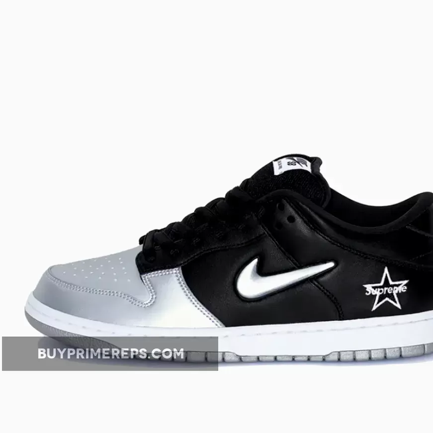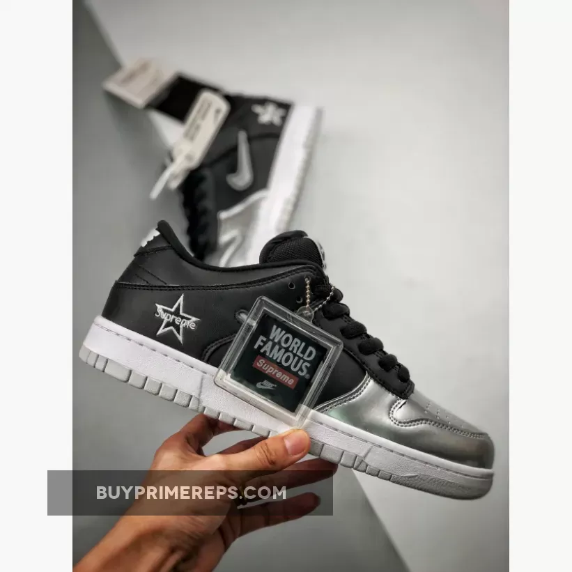 The Supreme x Nike SB Dunk Low collaboration showcases a unique and distinctive design that sets it apart from the original Dunk Low models. The sneakers feature a black-based leather upper with a metallic silver toe box, creating a striking contrast. The toe box is made from a Foamposite-like material, adding a touch of luxury and durability to the shoe.