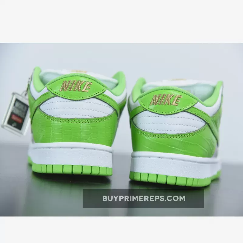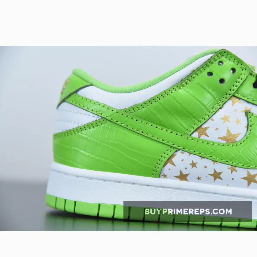 The Supreme x Nike SB Dunk Low Stars Mean Green features a striking colorway, combining a bold Mean Green shade with metallic gold accents. The result is a visually stunning sneaker that is sure to turn heads wherever you go. The upper is constructed with a smooth leather material, providing a sleek and premium look. Adding to the luxurious aesthetic, the panels of the shoe are adorned with faux crocodile leather, giving it a rugged yet refined appeal.