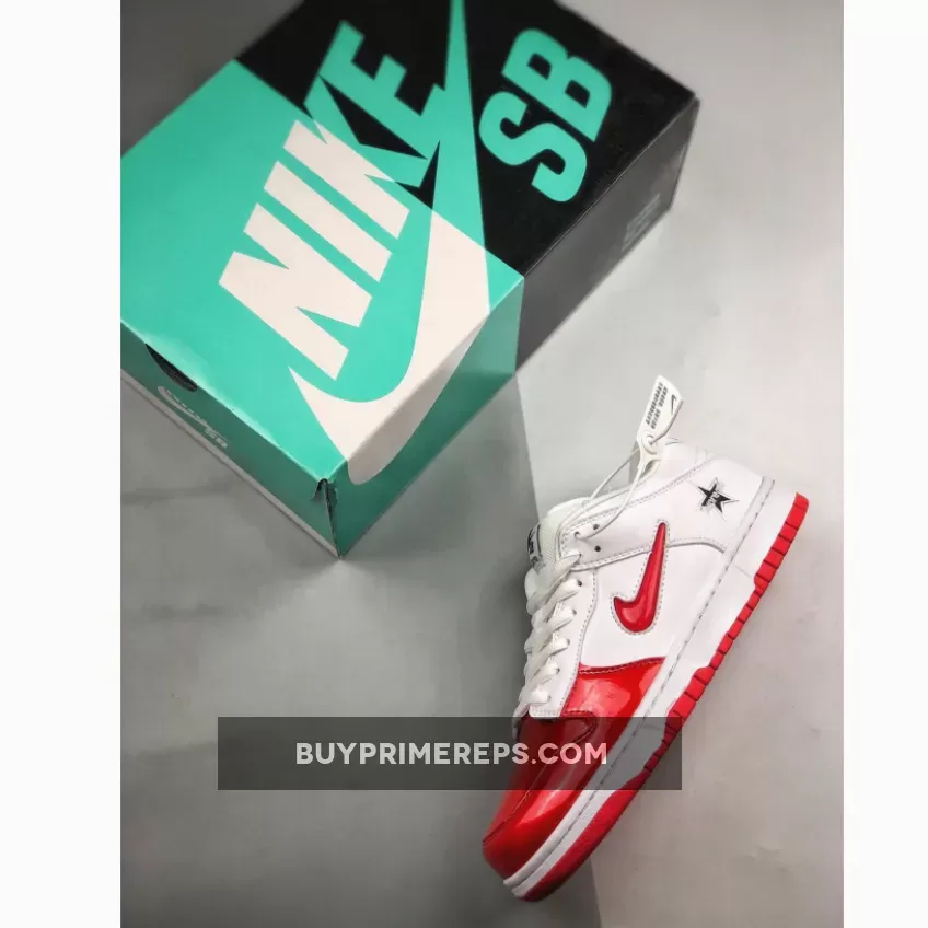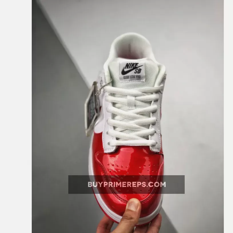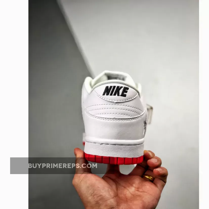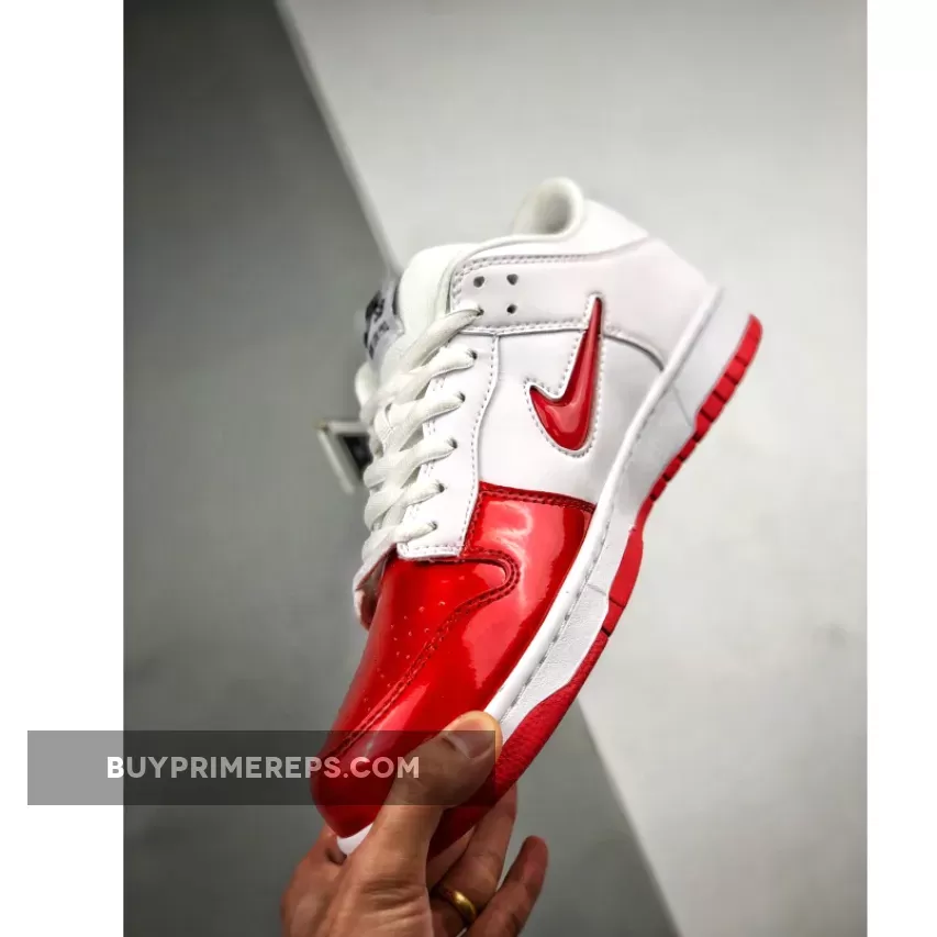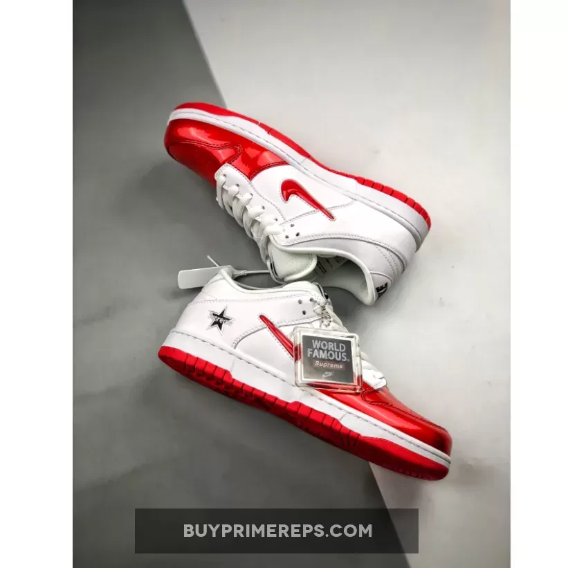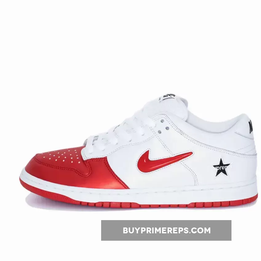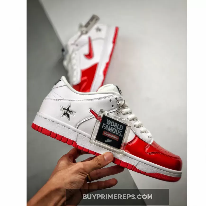 The Supreme x Nike SB Dunk Low Red White is a highly anticipated collaboration between two iconic brands. This sneaker features a striking colorway, with a red and white combination that is sure to turn heads. The upper is constructed of premium full-grain leather, giving it a luxurious feel and adding durability to the shoe. The red toe panel adds a pop of color and creates a unique look.