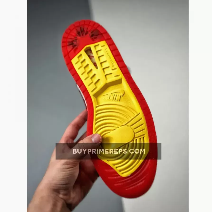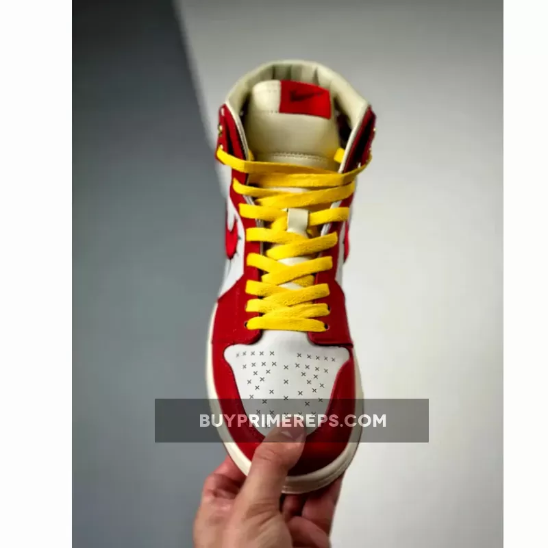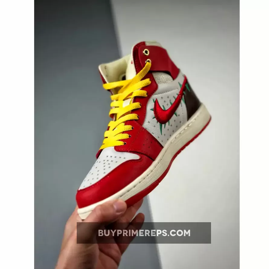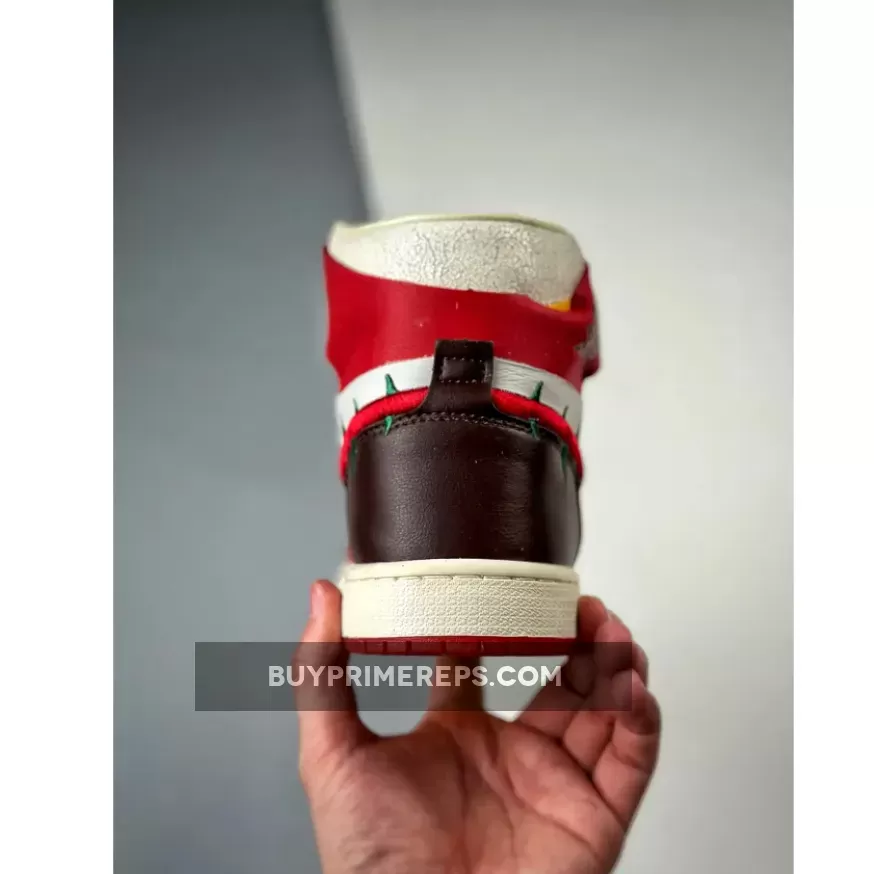 The color scheme of this collaboration is a classic combination of white and red. The shoe features a white leather base, which is complemented by “Gym Red” leather overlays that transition to a dark brown color at the heel counter. This creates a visually appealing contrast that adds depth to the design.