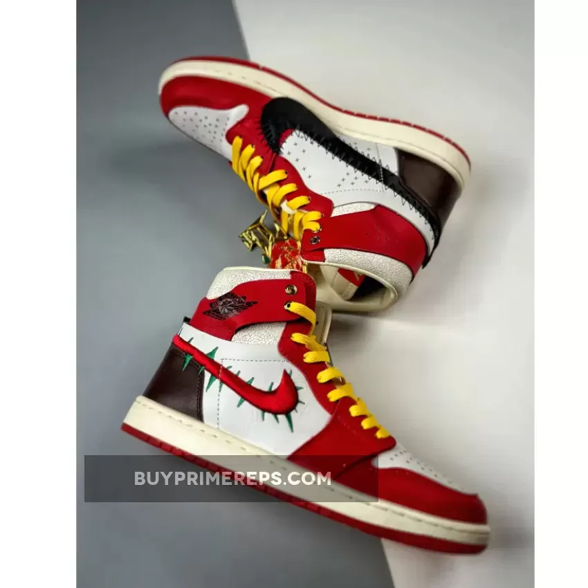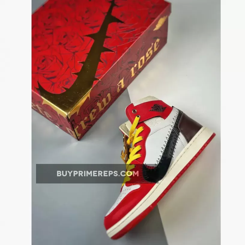 The standout feature of this collaboration is the asymmetrical Swoosh detailing. The left shoe boasts an oversized black leather Swoosh with zig-zag stitching, while the right shoe features an embroidered red Swoosh with green thorns, resembling a rose’s prickles. This unique design element adds a touch of edginess and sets this collaboration apart from others.