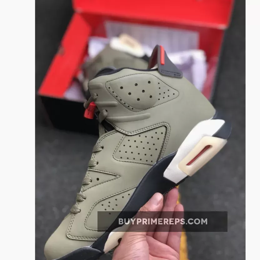 The design of the Travis Scott x Air Jordan 6 Retro “Olive” is centered around earth tones, with a Medium Olive, Black, Sail, and University Red color scheme. The upper of the sneaker is constructed from a luxurious olive-based nubuck material, giving it a premium and high-end look. Black detailing is seen throughout the shoe, adding depth and contrast to the overall design. The University Red accents provide a pop of color, making this sneaker stand out from the crowd.