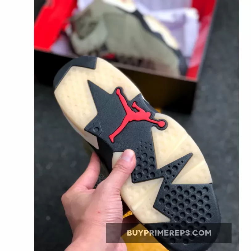 The midsole of the Travis Scott x Air Jordan 6 Retro “Olive” is done in a clean Sail color, adding a touch of elegance and sophistication. The translucent outsole is glow-in-the-dark, adding an element of surprise and fun to the sneaker. When the lights go out, the outsole illuminates, creating a striking and attention-grabbing effect.