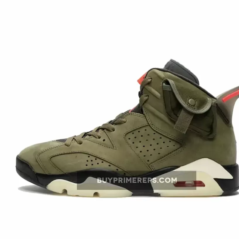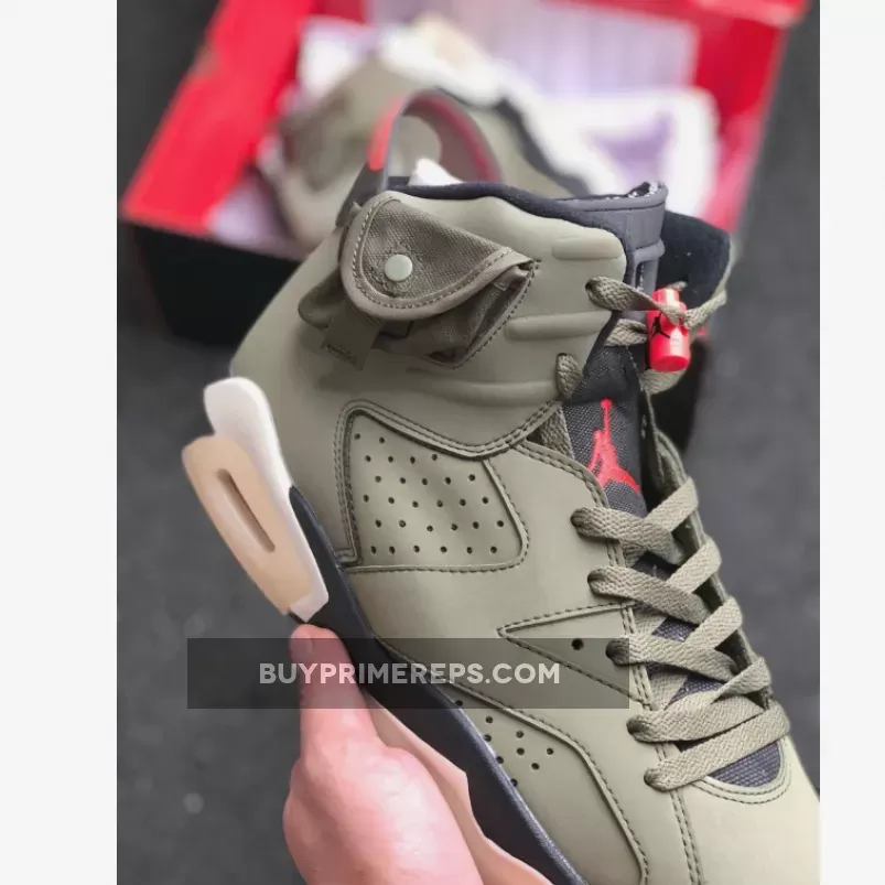 One of the standout features of the Travis Scott x Air Jordan 6 Retro “Olive” is the addition of a side pocket on the collar. This pocket, equipped with a snap closure, is reminiscent of the pockets found on cargo pants and military gear. It adds a functional and utilitarian touch to the sneaker, while also adding a unique and eye-catching element to the overall design.