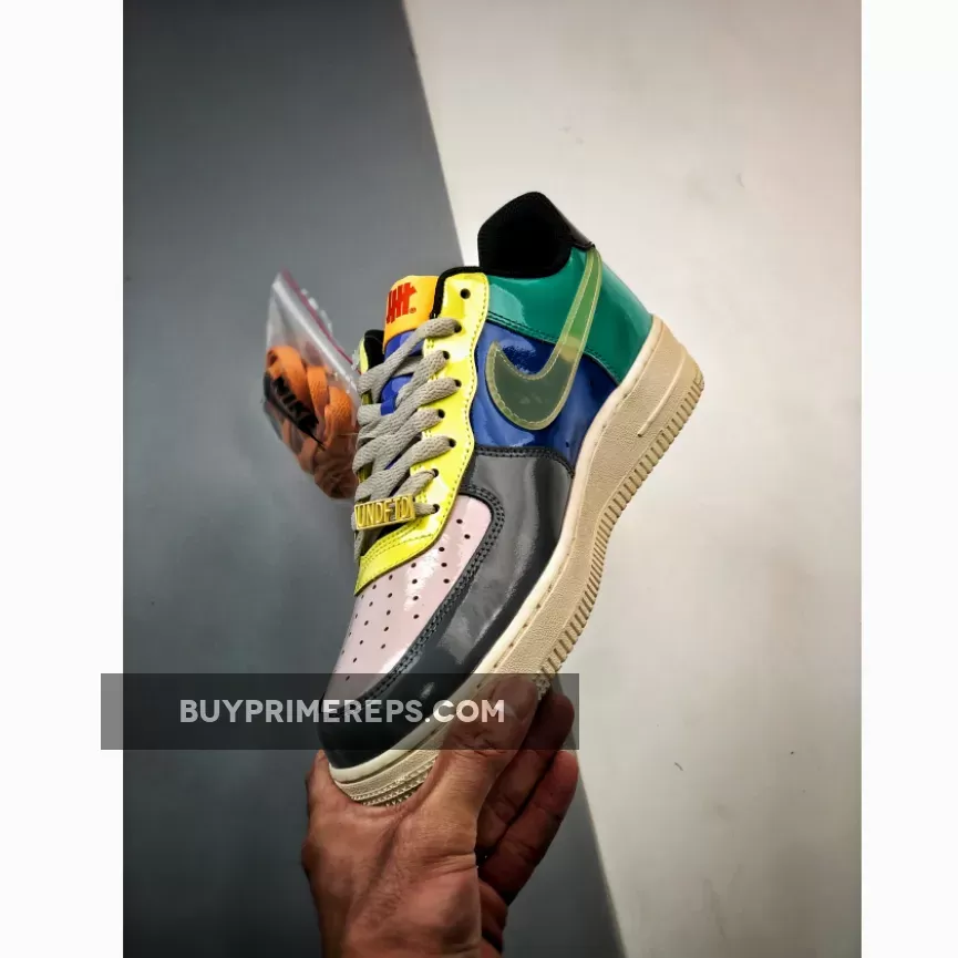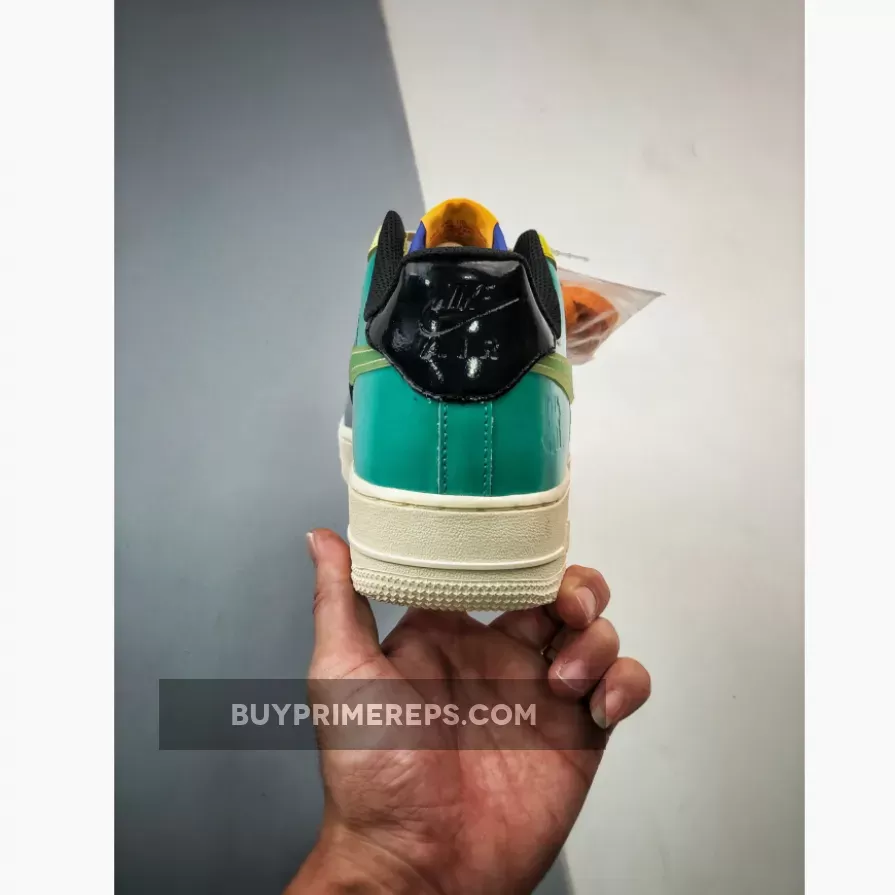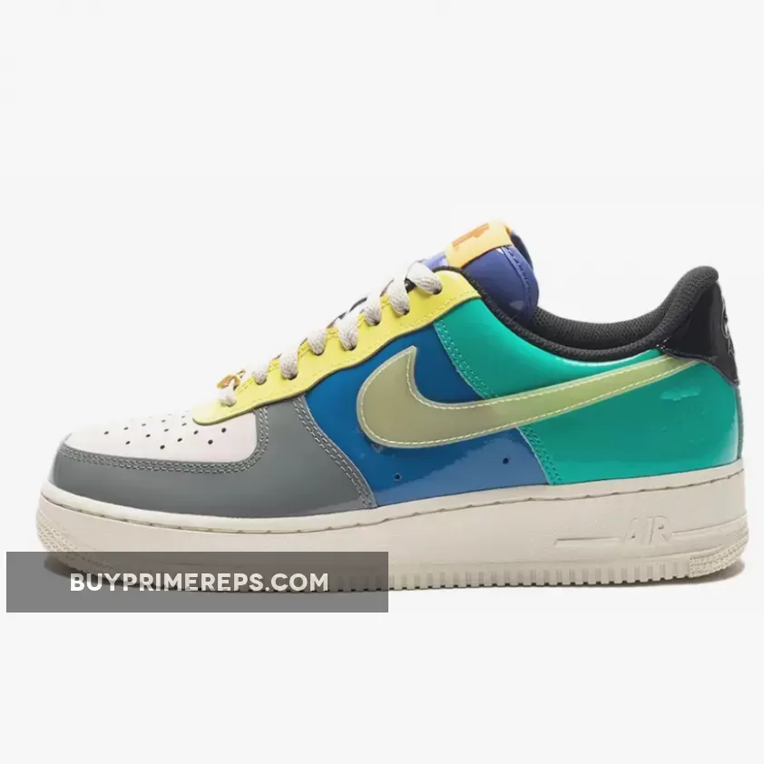 The UNDEFEATED x Nike Air Force 1 Low Multi Patent Teal Grey also offers comfort and support. The shoe is equipped with a chunky white midsole, which conceals a full-length Nike Air cushioning unit. This provides maximum comfort and cushioning for all-day wear.