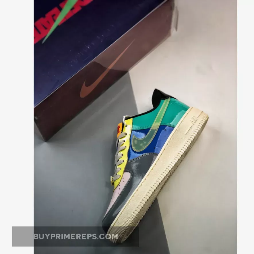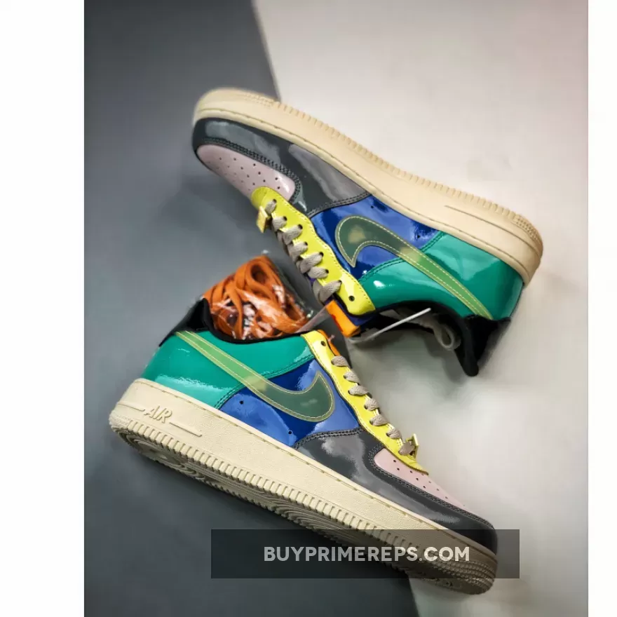 The UNDEFEATED x Nike Air Force 1 Low Multi Patent Teal Grey is a striking collaboration between sneaker retailer UNDEFEATED and Nike. This latest release showcases a unique and eye-catching design, featuring a patent leather upper in a combination of teal green, cyan blue, and pastel pink. The result is a shoe that is sure to turn heads and make a statement.