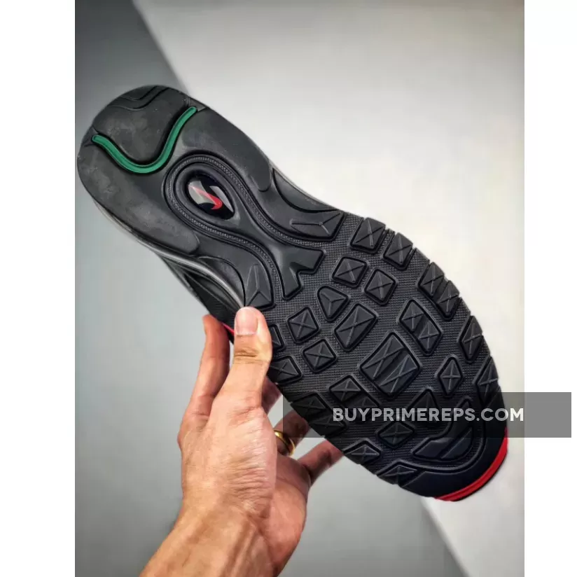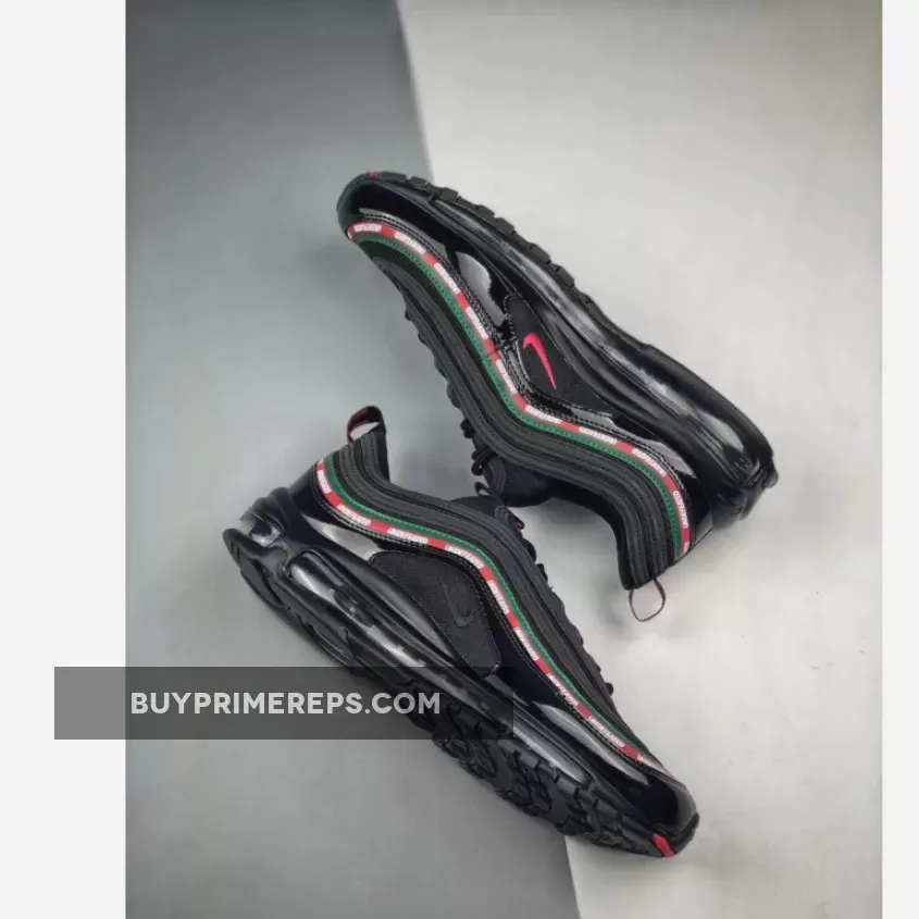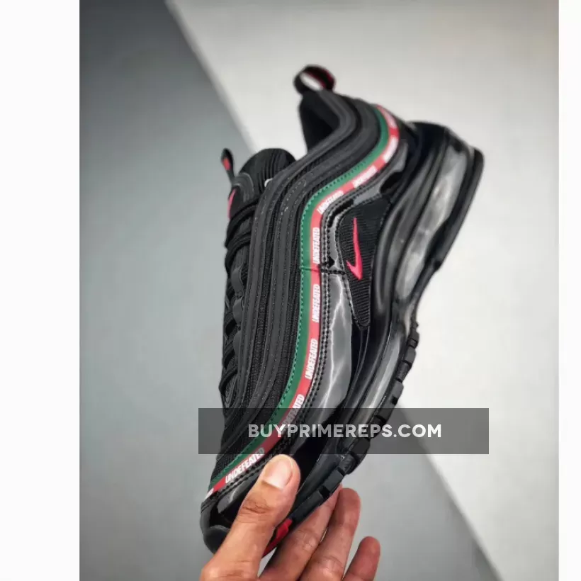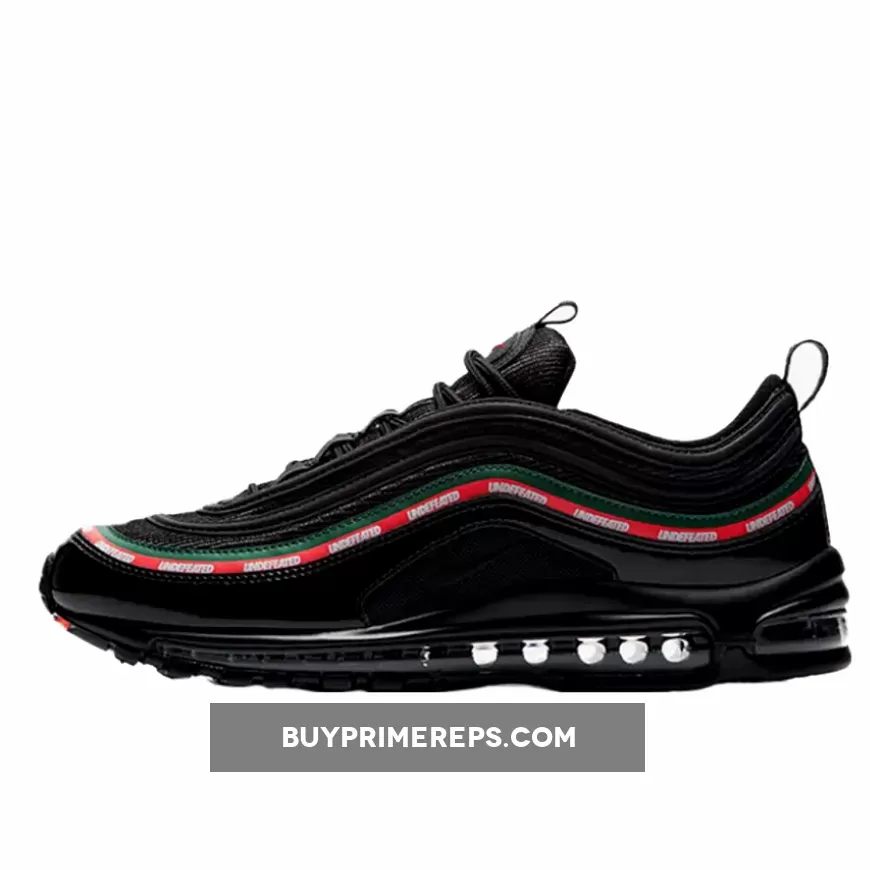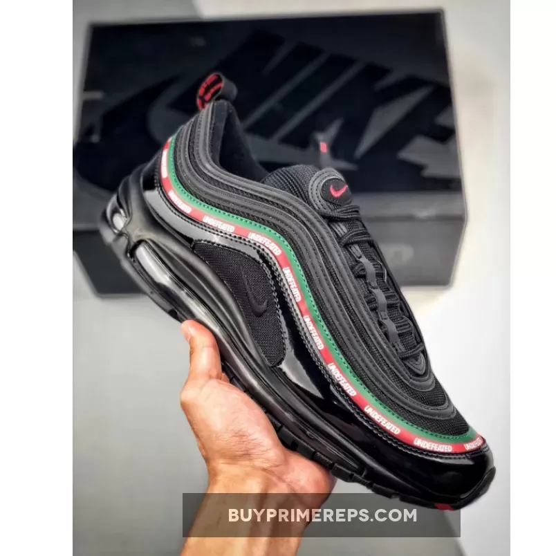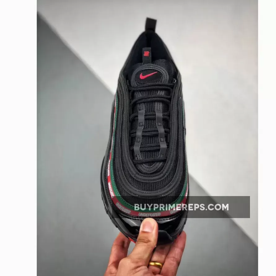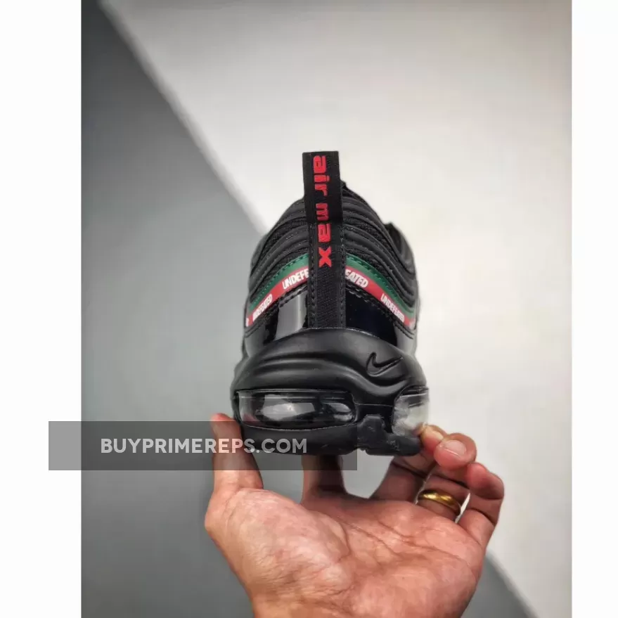 The Undefeated x Nike Air Max 97 OG ‘Black’ features a black-based upper constructed with premium materials such as leather and patent leather. The patent leather mudguard adds a touch of luxury to the design while also providing protection from the elements. The wavy side panel stripes are adorned with Gucci-inspired colors of Gorge Green and Speed Red, further highlighting the connection to Italy. The Undefeated branding is prominently displayed on the stripes, showcasing the collaboration between the two iconic brands.