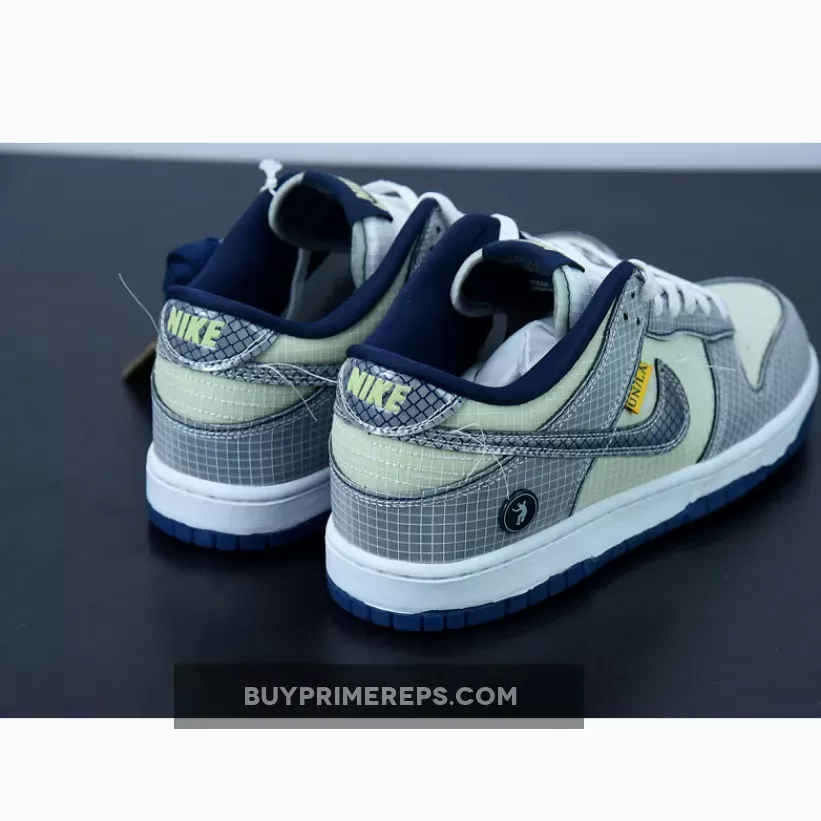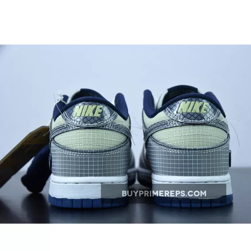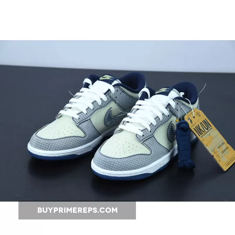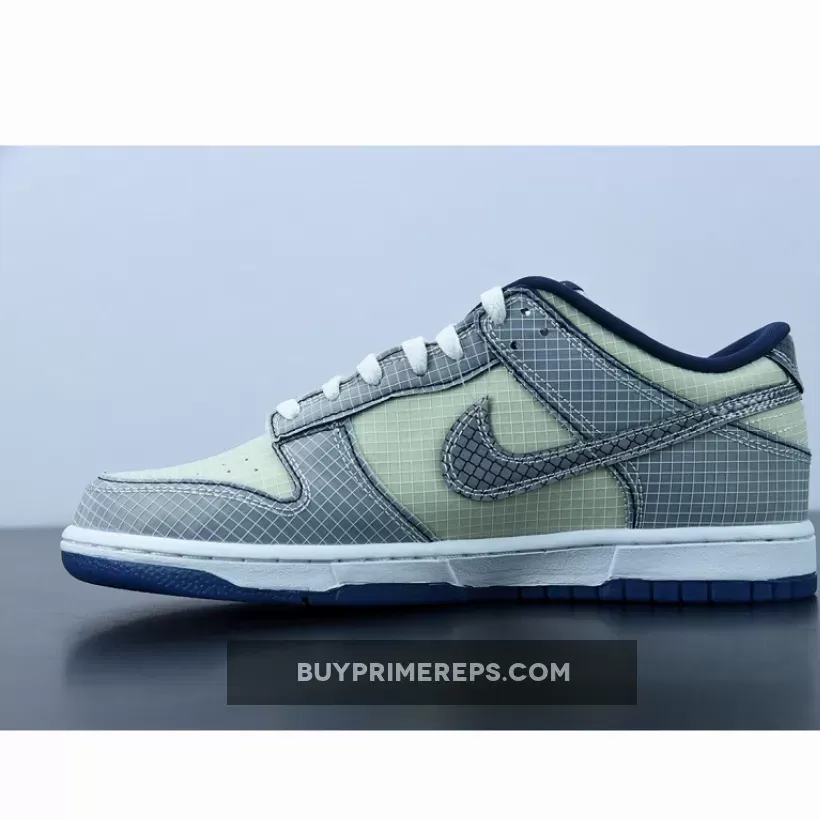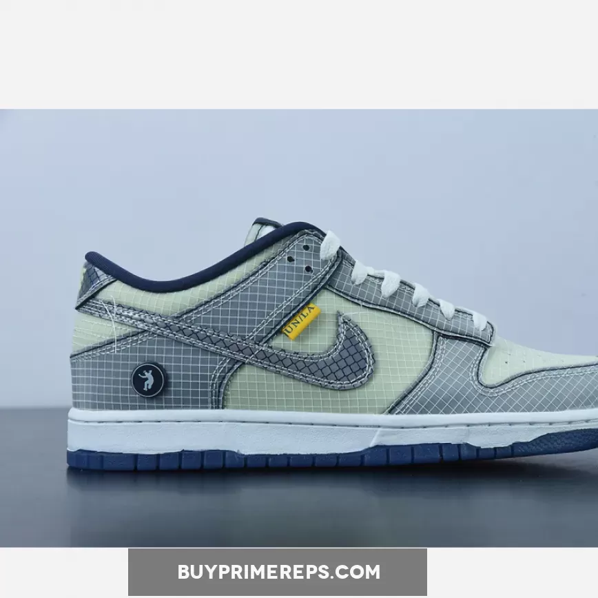 The Union LA x Nike Dunk Low Midnight Navy features a unique design that blends classic elements with modern flair. The upper of the sneaker is constructed with a ripstop material in a cool Lime Ice colorway. This translucent ripstop nylon material is adorned with a white gridded pattern, adding a touch of texture to the shoe’s overall look.