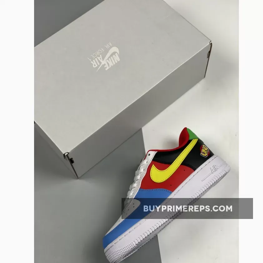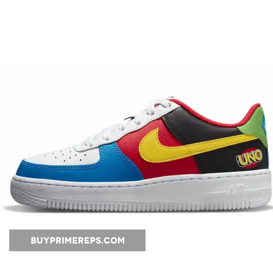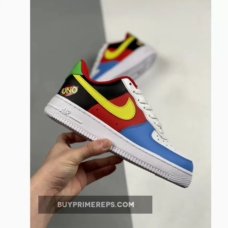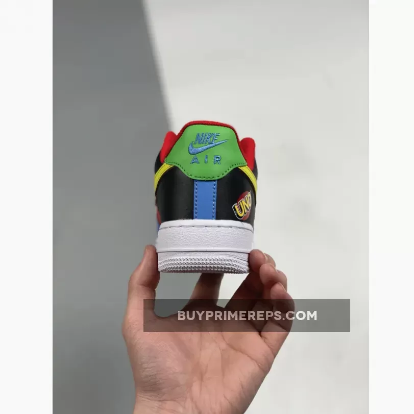 Completing the design is a bright green heel tab with an embroidered blue Nike Air logo, adding a pop of color and a touch of branding to the shoe. The overall aesthetic of the Uno x Nike Air Force 1 Low Multi is a fusion of sporty and playful elements, capturing the essence of both the iconic sneaker and the beloved card game.