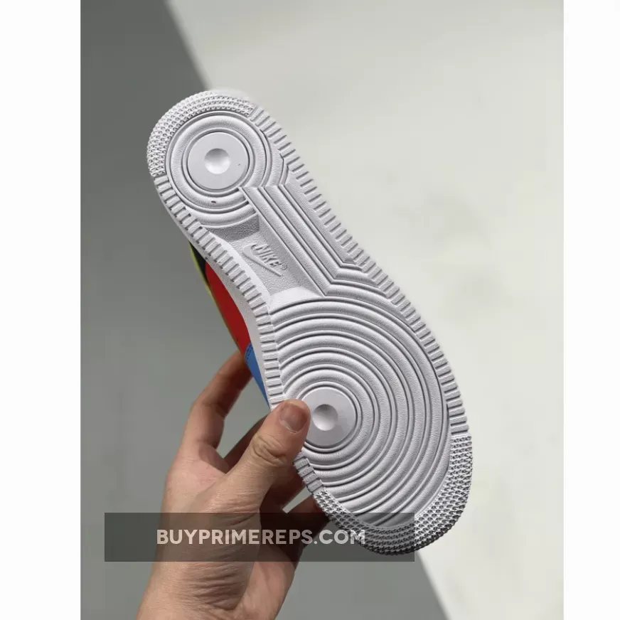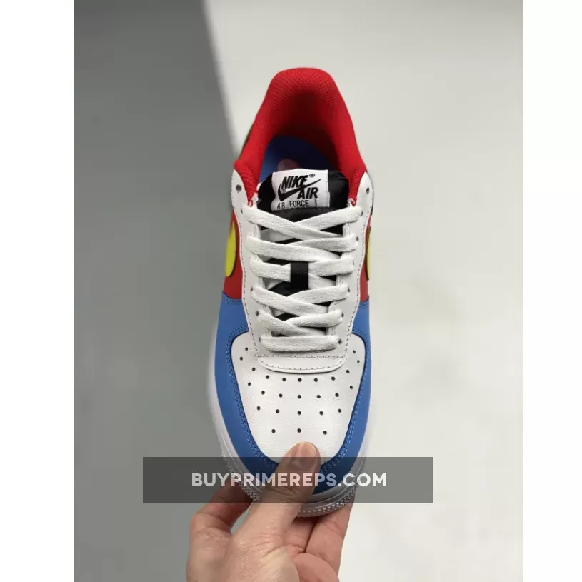 This special edition Air Force 1 Low features a color scheme inspired by the vibrant hues of the Uno cards. The upper is constructed with a combination of smooth white and perforated leather, providing a clean and premium look. The toe box and eye stay panel showcase the white leather, while the overlays in primary colors of red, blue, and yellow create a striking contrast. The toe cap is a bold blue, while the mid-panel is a vibrant red, making these sections stand out and catch the eye.